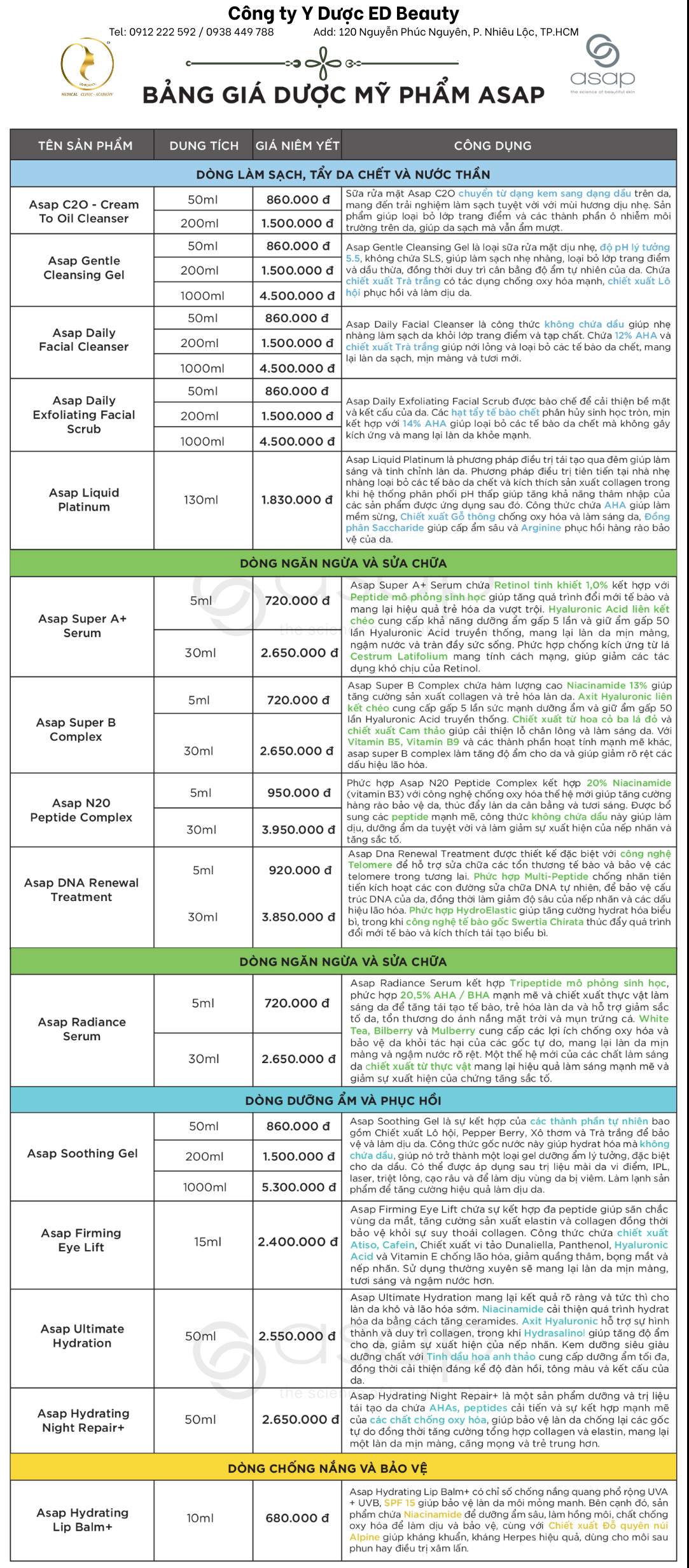 Ed Beauty xin gửi đến bạn bảng giá tham khảo mới nhất của dòng sản phẩm asap chính hãng năm 2025.