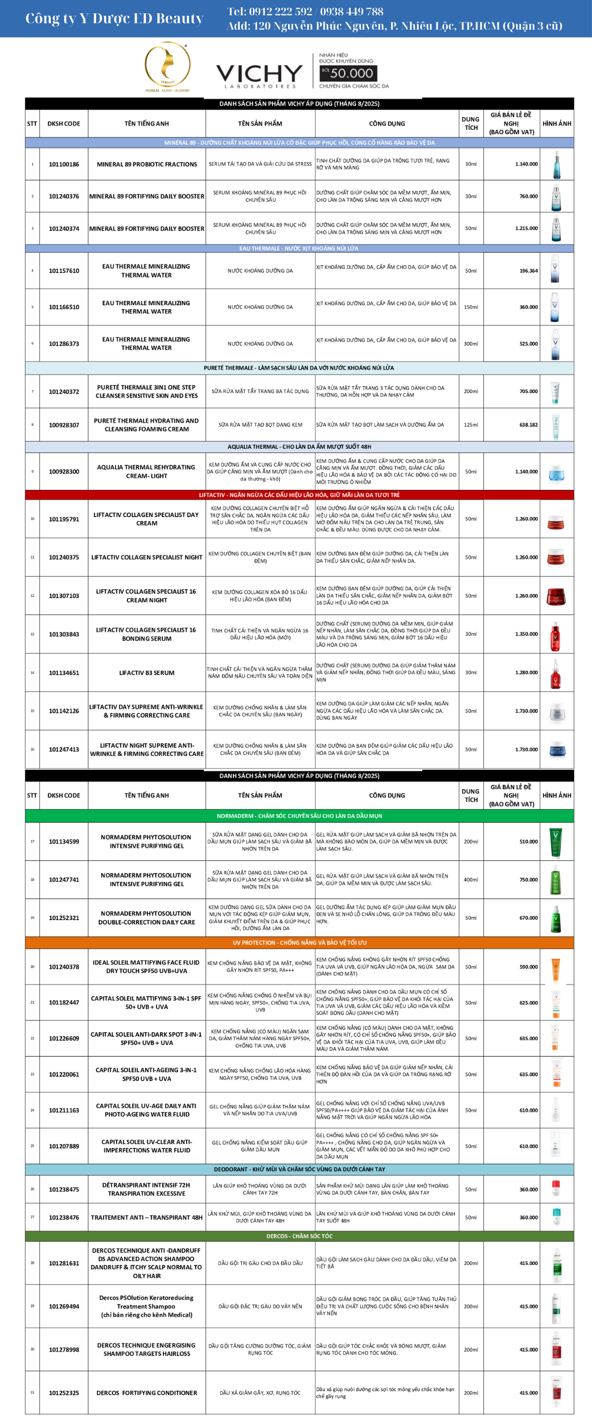 Ed Beauty tự hào là đơn vị cung cấp Dược mỹ phẩm chính hãng của nhiều thương hiệu lớn trên thế giới. Mời bạn tham khảo bảng giá chi tiết từng sản phẩm mỹ phẩm Vichy dưới đây.