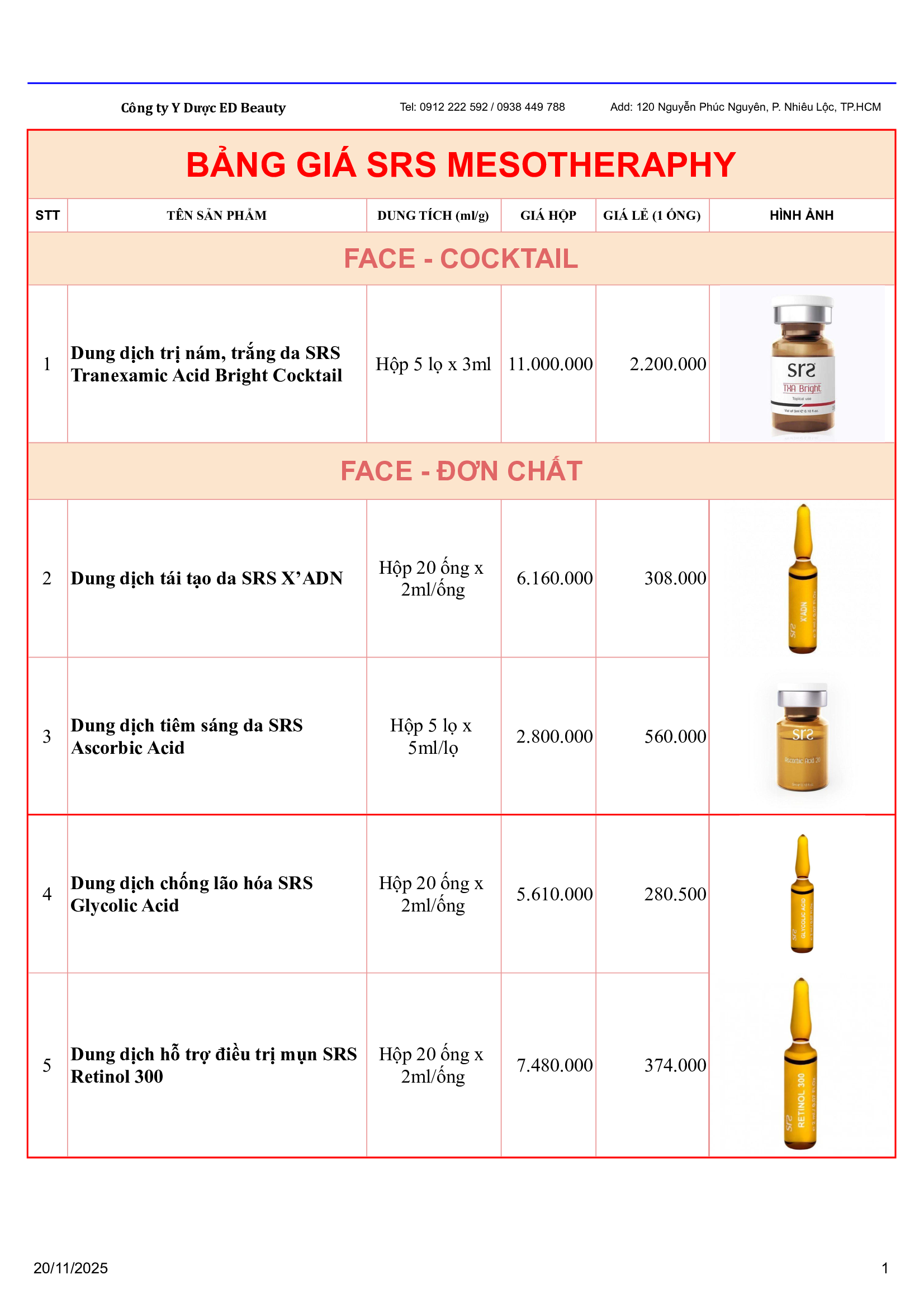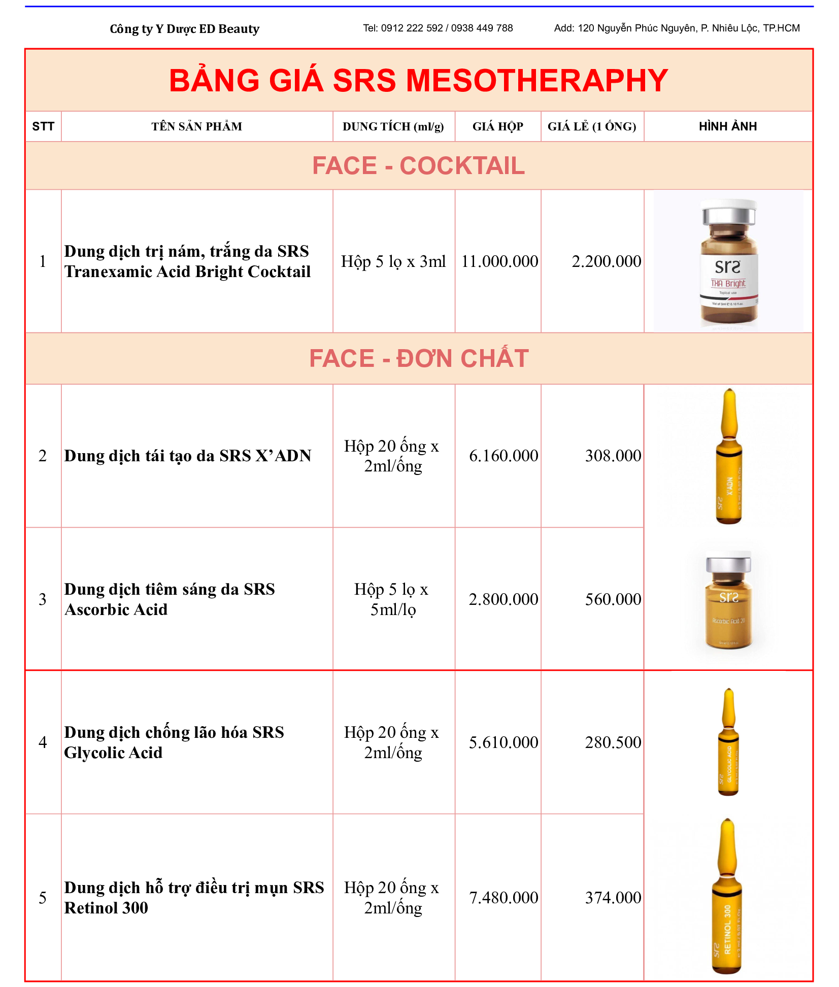 Cập nhật được xu hướng làm đẹp của khách hàng, ED Beauty trân trọng thông báo bảng giá sản phẩm Mesotherapy SRS đến từ Bỉ cụ thể như sau: