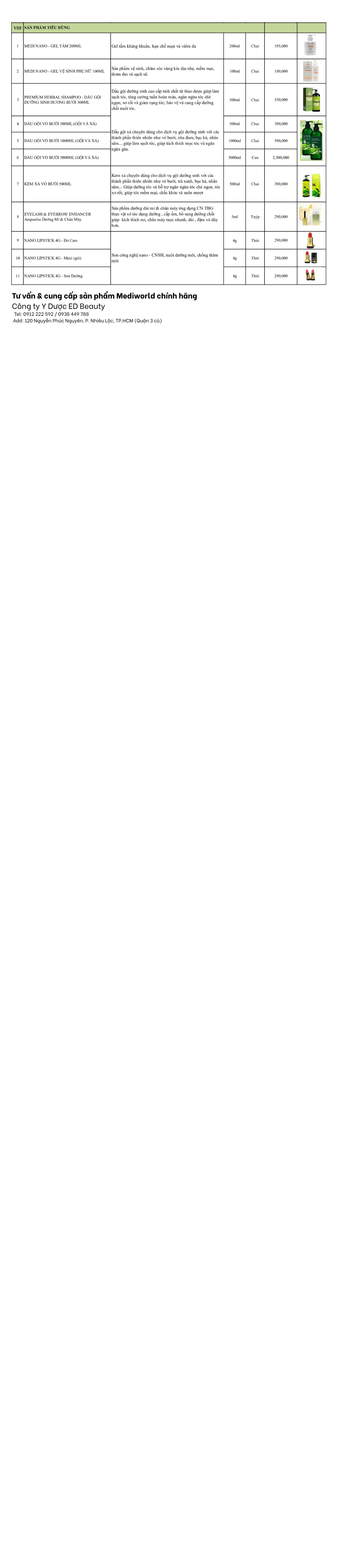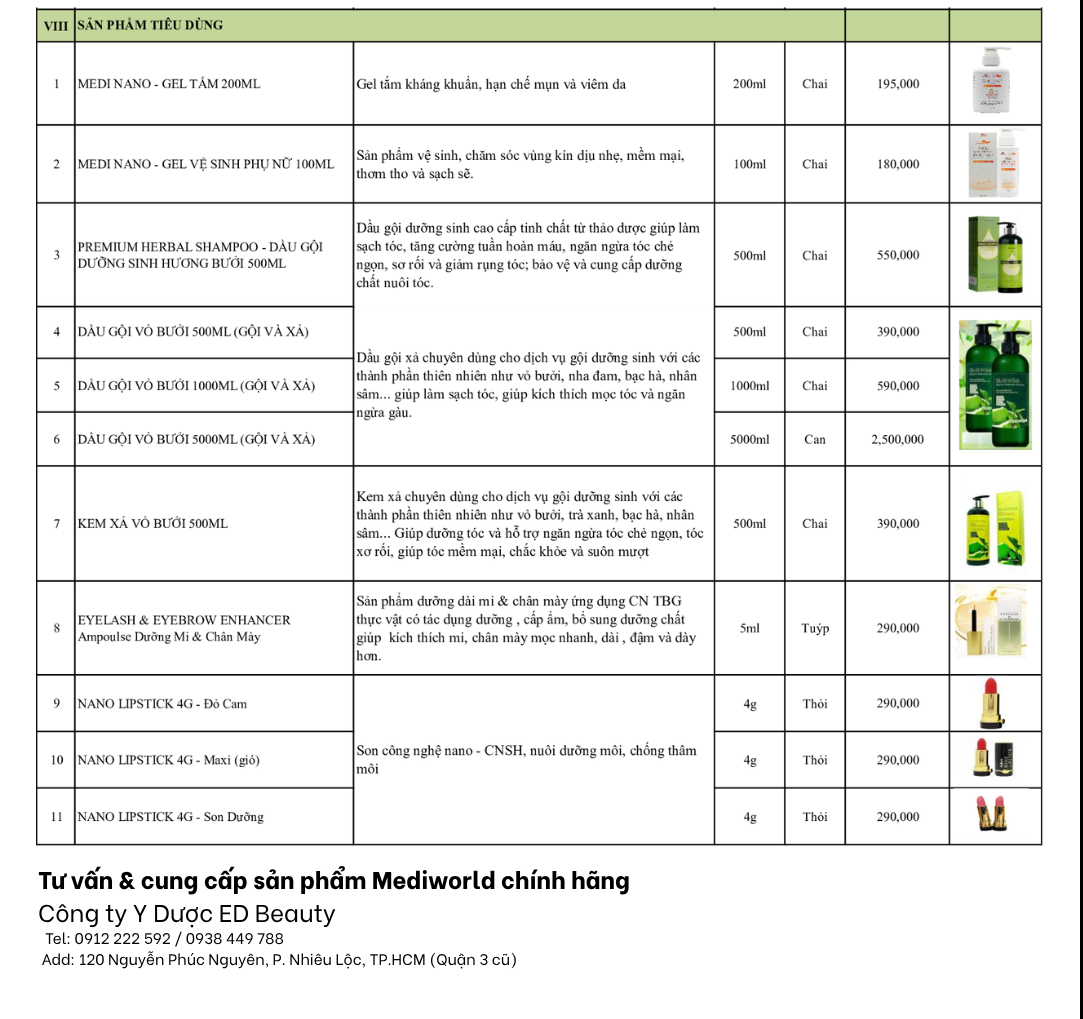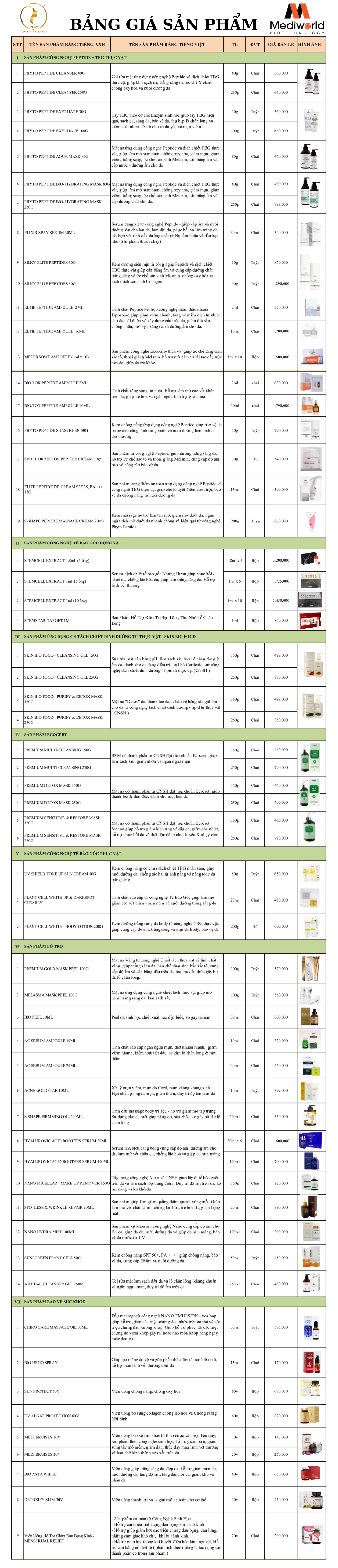 BẢNG GIÁ SẢN PHẨM MỸ PHẨM MEDIWORLD