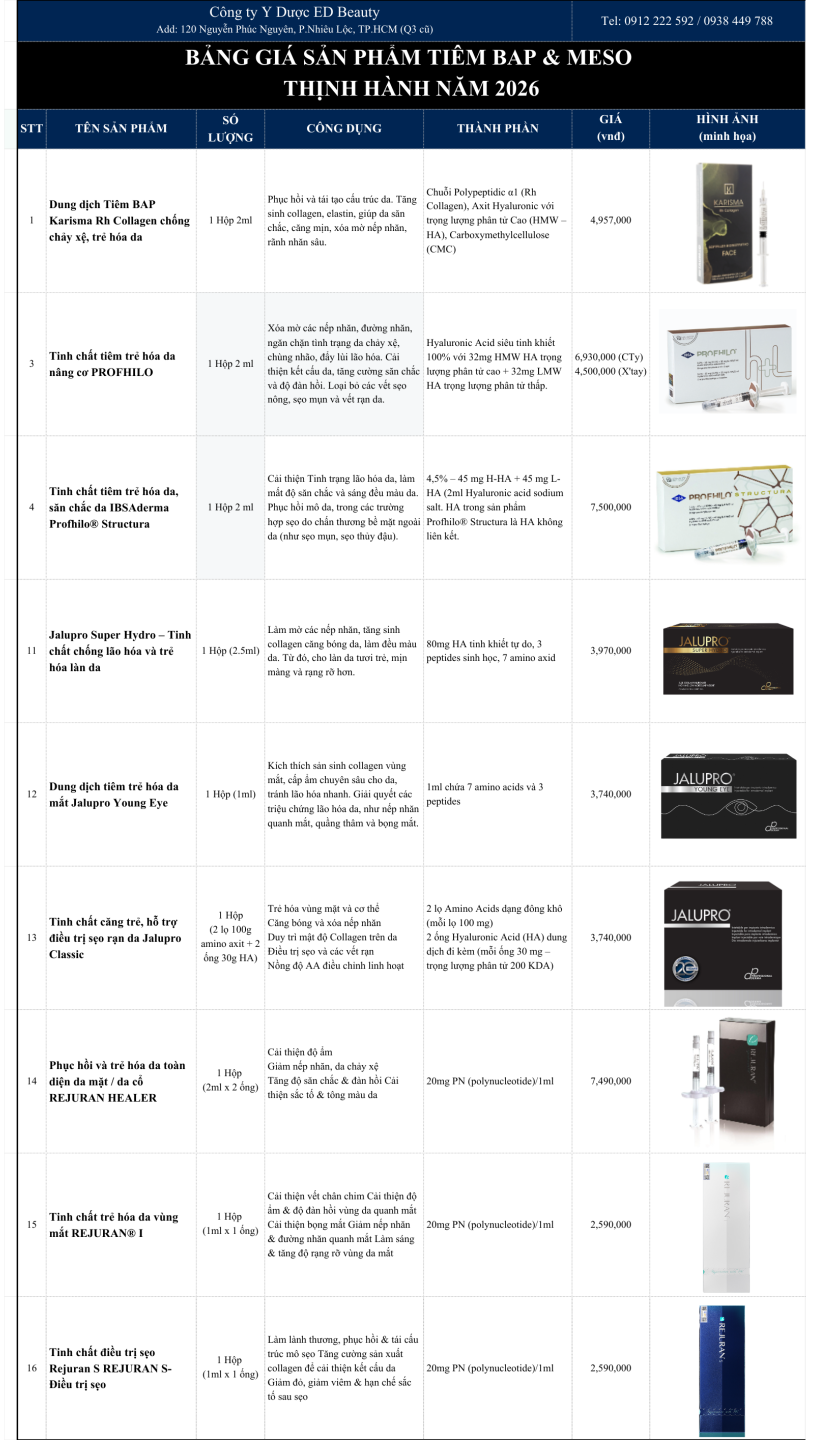 Bảng giá sản phẩm tiêm BAP và Mesotheraphy tại ED Beauty