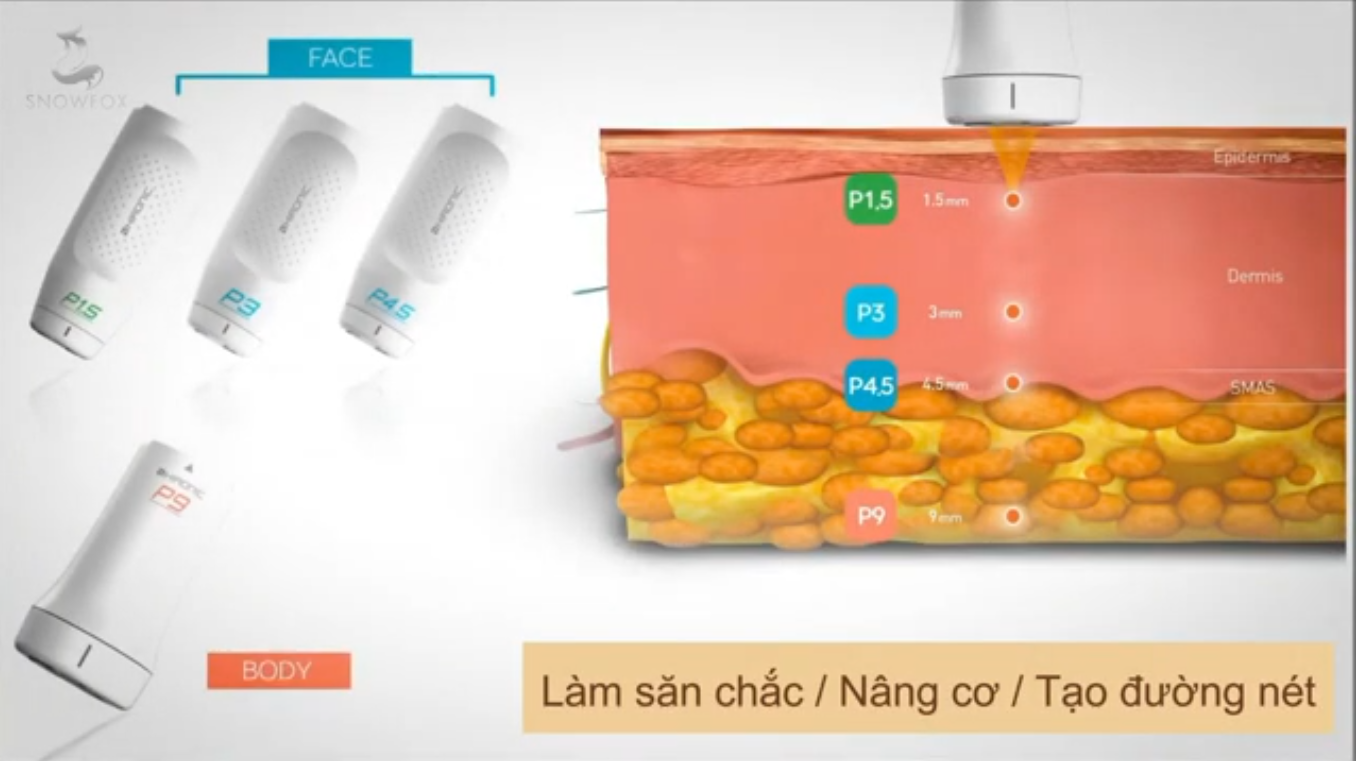 Sóng MFU tác động sâu đến lớp SMAS (3.0 – 4.5mm) – nơi đóng vai trò như “bộ khung” nâng đỡ khuôn mặt.