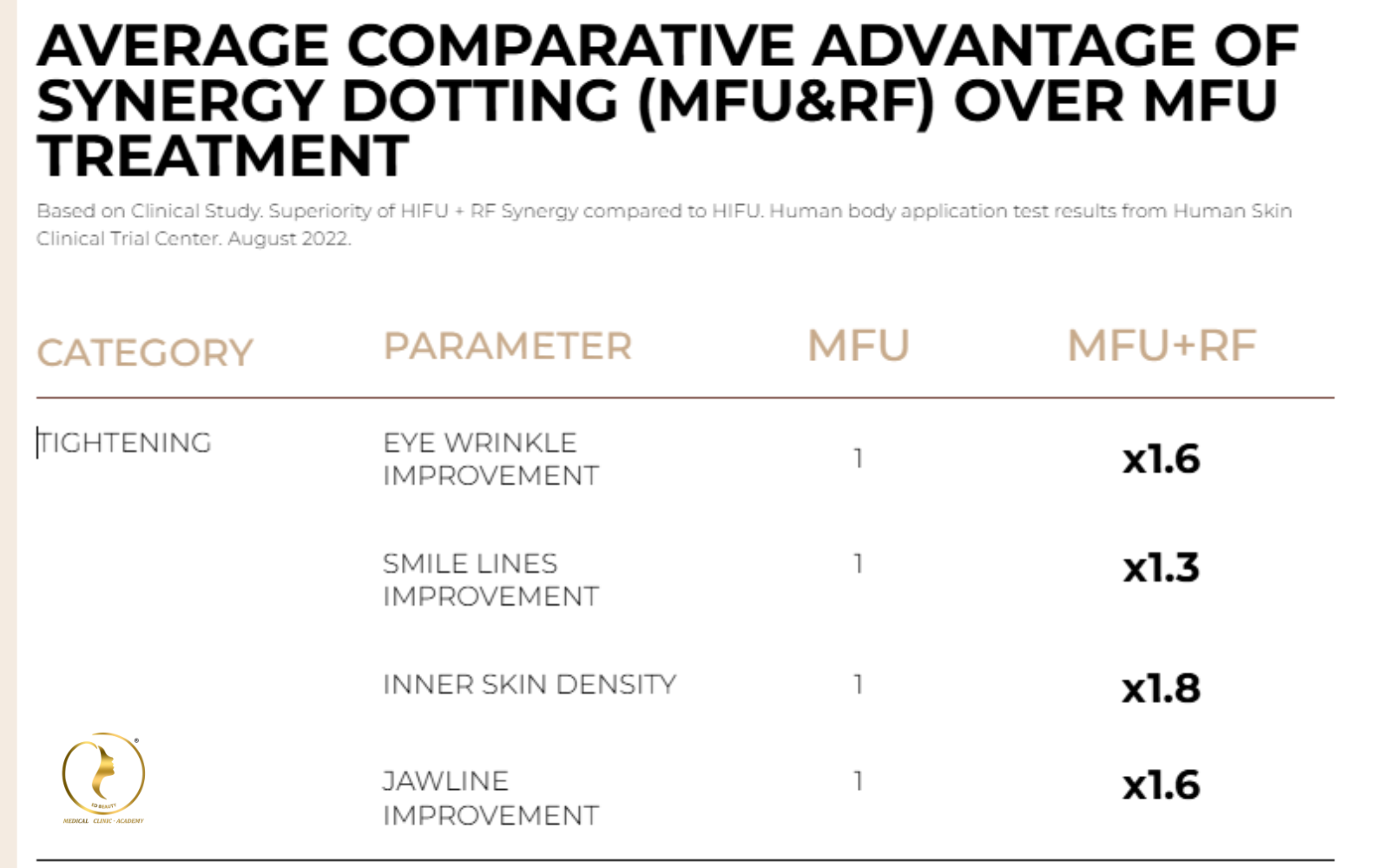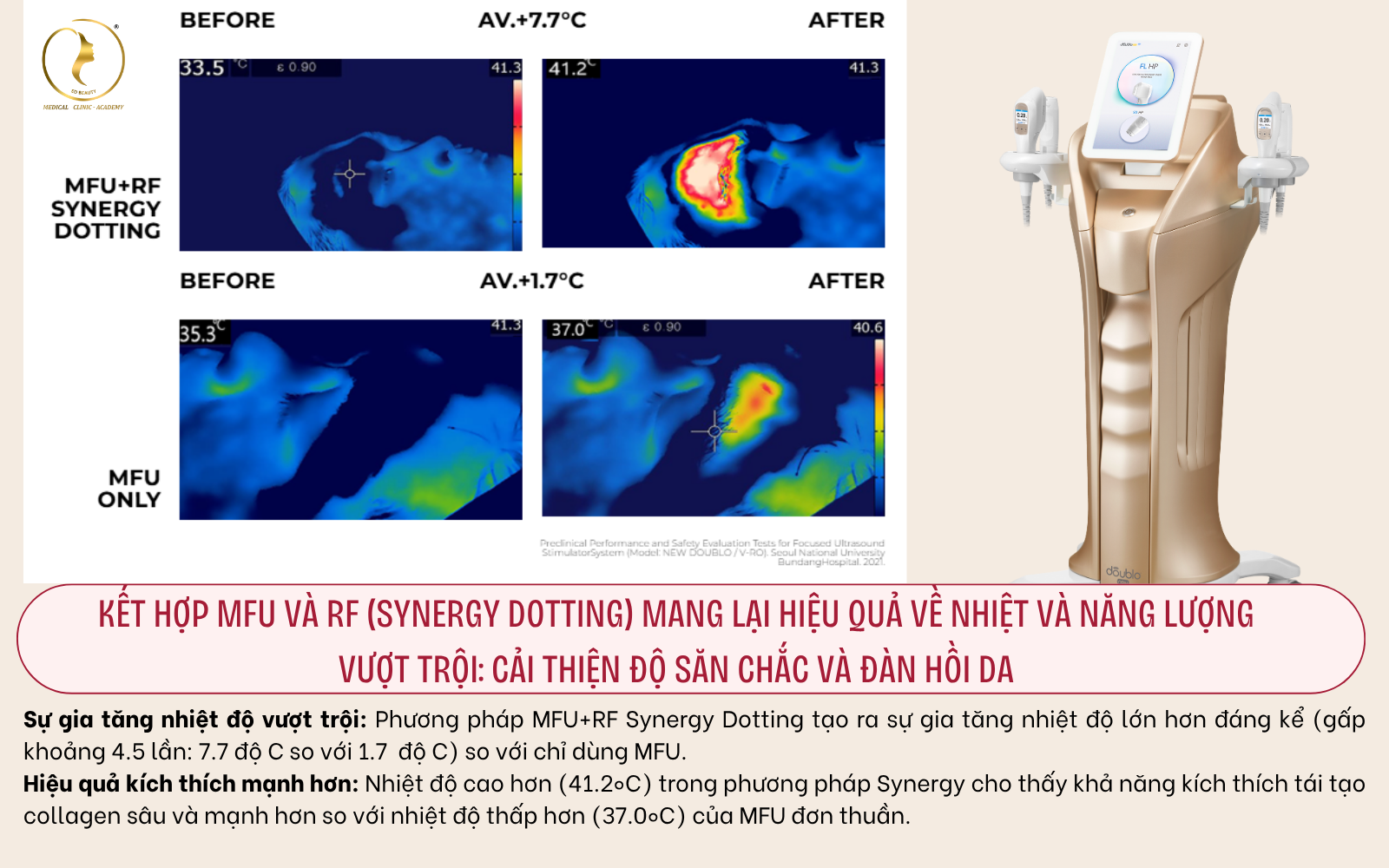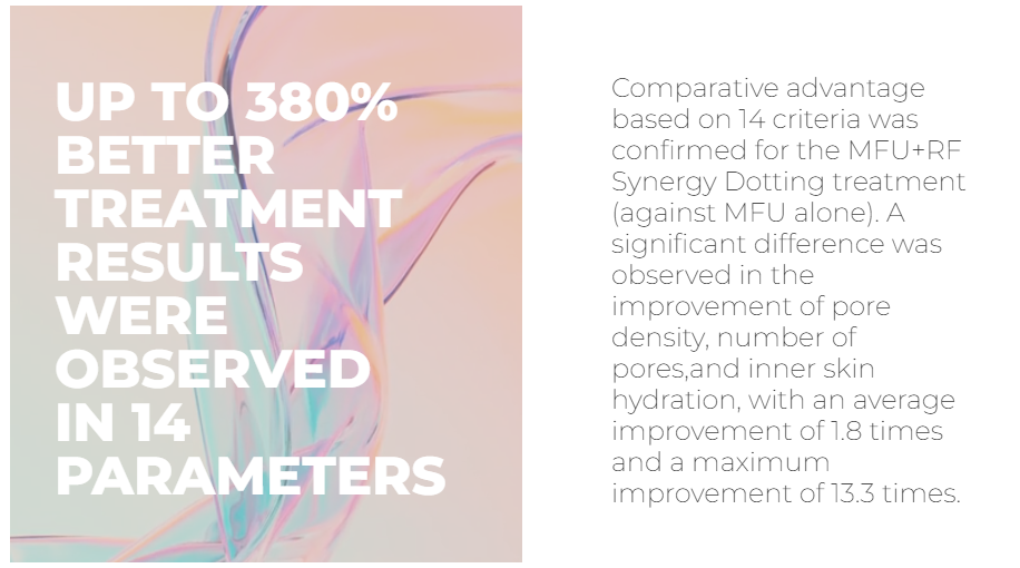 Các nghiên cứu quốc tế đã ghi nhận công nghệ MFU + RF Synergy đạt hiệu quả trẻ hóa vượt trội đến 380%, thể hiện khả năng tác động sâu và đồng bộ lên nhiều tầng da: