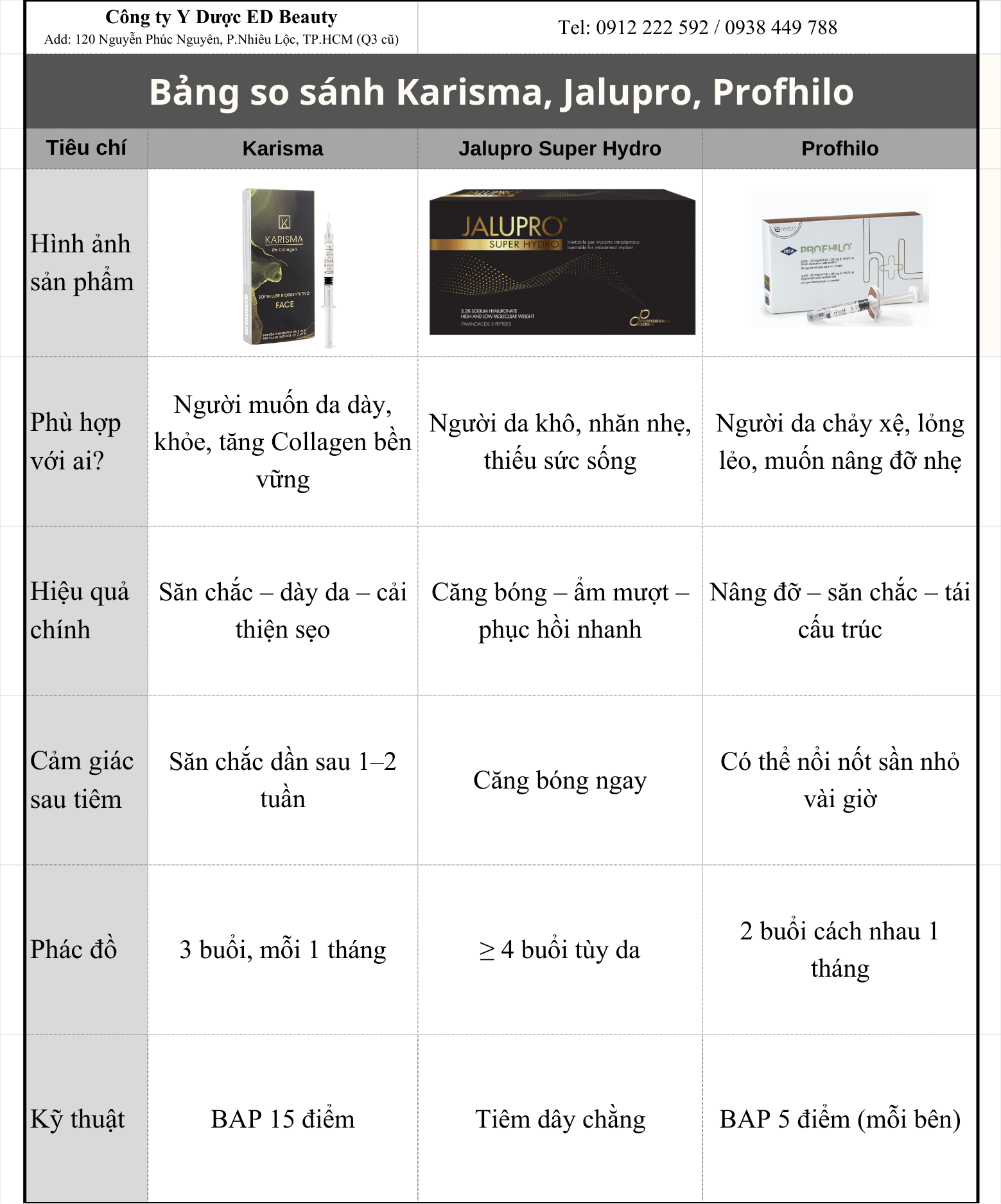 Tuy cùng thuộc nhóm tiêm tái tạo da, Karisma – Jalupro Super Hydro – Profhilo lại mang đến những hiệu quả rất khác nhau vì mỗi sản phẩm sử dụng thành phần cốt lõi và cơ chế tác động riêng. Hiểu rõ sự khác biệt sẽ giúp bạn biết sản phẩm nào phù hợp nhất với tình trạng da của mình.