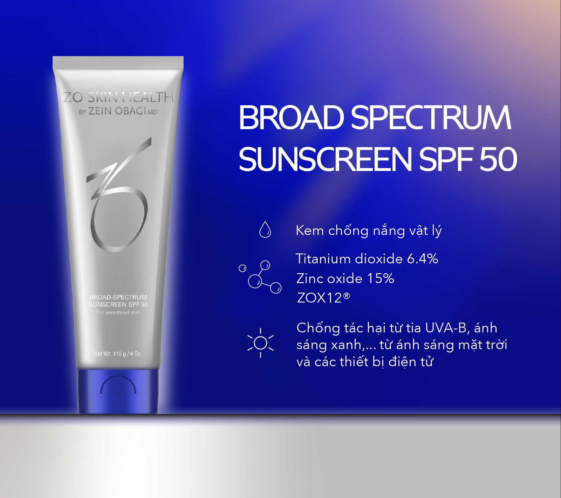 ZO® Broad-Spectrum SPF 50 bảo vệ da trước tia UVA/UVB, ánh sáng xanh (HEV) và tia hồng ngoại (IR-A) – những nguyên nhân chính khiến da sạm và lão hóa sớm.