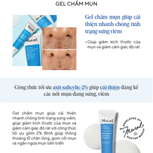 - Mụn là một trong những vấn đề về da tổn thương phổ biến nhất ở mọi lứa tuổi, đặc biệt là với khí hậu đầy ô nhiễm như ở nước ta hiện nay. Có nhiều giải pháp để trị mụn hiệu quả nhưng phải tốn rất nhiều thời gian và công sức. Trong khi đó, Gel trị mụn trong 4 giờ đến từ Murad không chỉ nhanh chóng trả lại cho bạn làn da mịn màng, căng mướt mà còn duy trì sức khỏe làn da. Giải pháp trị mụn 4 giờ từ hệ thống chuyên gia Murad số 1 Hoa Kỳ giúp giải quyết triệt để và nhanh chóng các vấn đề về mụn