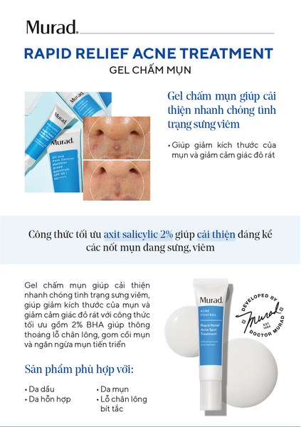 - Gel trị mụn cấp tốc đột phá Rapid Relief Acne Spot Treatment hoạt động theo nguyên lý khoa học nước trong tế bào của chính bác sĩ Dr. Howard Murad. Đúc kết sau 50 năm nghiên cứu và 28 năm ứng dụng thực tiễn, sản phẩm trị mụn 4 giờ của hệ thống Murad nhận được bằng sáng chế khoa học độc quyền cho phát minh độc đáo của mình.