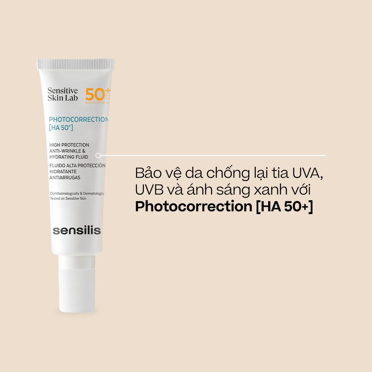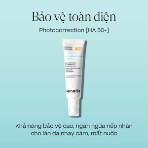 Sensilis Photocorrection [HA 50+] là sản phẩm chống nắng tích hợp dưỡng da ban ngày với chỉ số SPF 50+, giúp bảo vệ làn da trước tác hại của tia UVA, UVB và ánh sáng xanh. Sản phẩm được thiết kế dành cho làn da nhạy cảm, da thiếu ẩm và da có dấu hiệu lão hóa sớm, cần vừa chống nắng vừa phục hồi cấu trúc da.