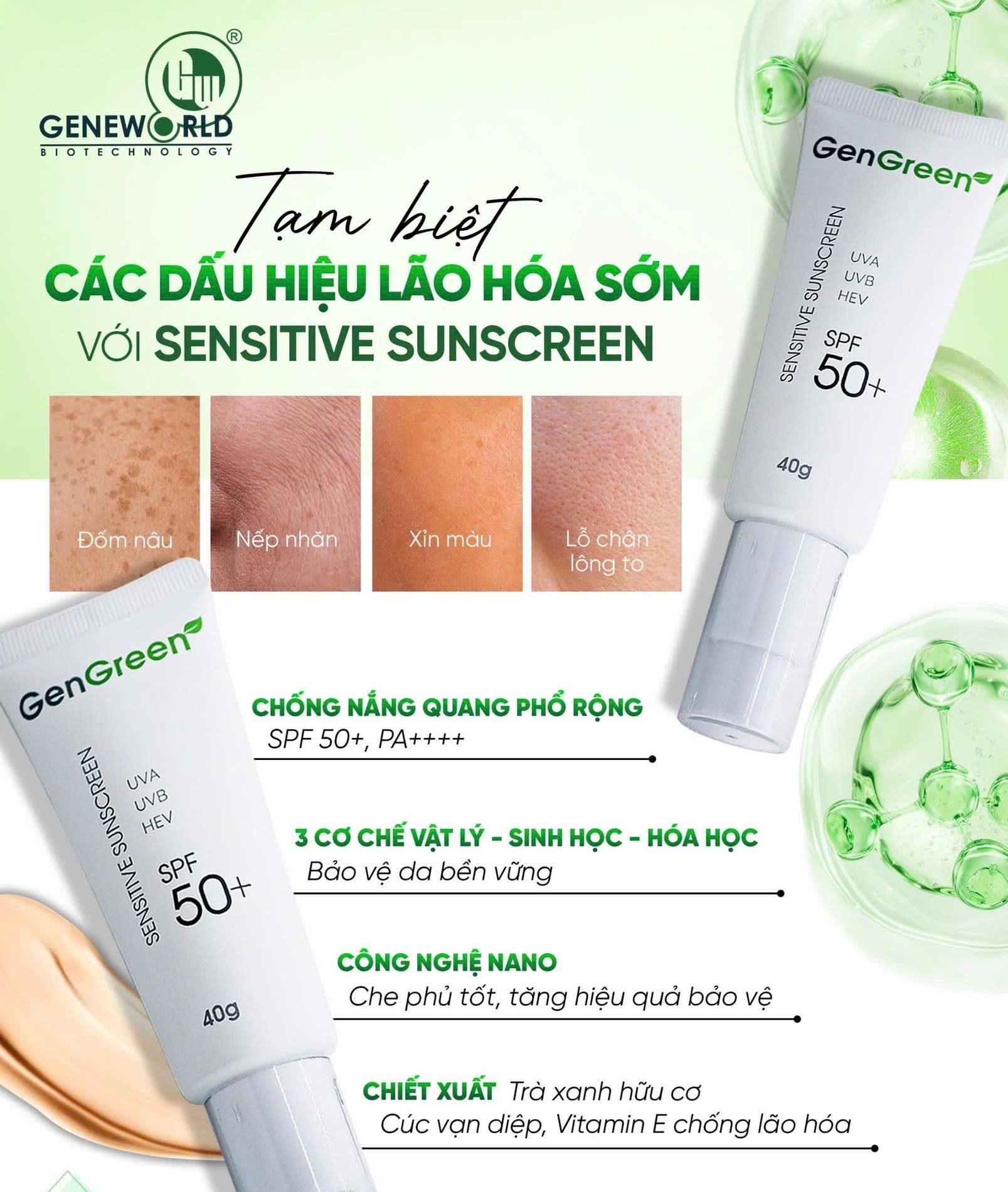 GenGreen Sensitive Sunscreen là kem chống nắng phổ rộng, giúp bảo vệ da khỏi tia UV, UVA, UVB và HEV, đồng thời tạo lớp nền sáng và che khuyết điểm cho da mịn màng.