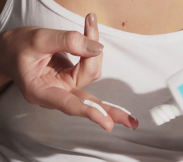 Lấy lượng kem Water Fluid SPF 50+ tương đương hai đốt ngón tay cho toàn bộ khuôn mặt