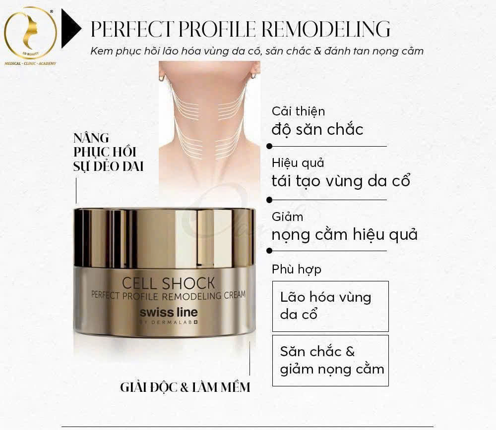 Da cổ mỏng manh hơn vùng da mặt và phải thường xuyên tiếp xúc nhiều. Nếu như không có một chế độ chăm sóc sớm, sẽ rất khó phục hồi khi bị lão hoá. Kem Cell Shock Perfect Profile Remodeling Cream được Swissline thiết kế riêng biệt cho sứ mệnh chăm đặc biệt vùng da cổ của bạn mỗi ngày.