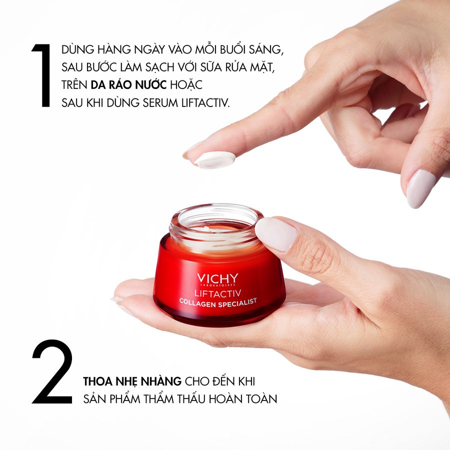 - Tần suất: Dùng Vichy Collagen Cream sáng và tối, sau bước làm sạch và làm dịu da.