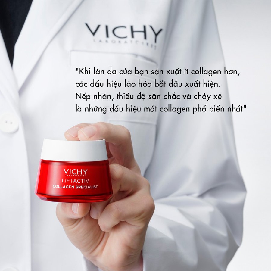 Vichy Liftactiv Collagen Specialist Cream là kem dưỡng chống lão hóa cao cấp đến từ Pháp, giúp giảm nếp nhăn, làm căng đầy da và săn chắc, với công thức chứa các thành phần hoạt tính mạnh như Peptide, Vitamin CG và nước khoáng núi lửa Vichy. Kem phù hợp với mọi loại da, kể cả da nhạy cảm, mang lại làn da tươi trẻ và đàn hồi hơn mỗi ngày, chuyên dành cho làn da thiếu hụt collagen, có dấu hiệu nhăn, kém săn chắc hoặc lão hóa sớm.