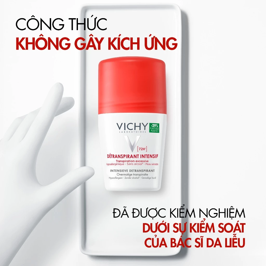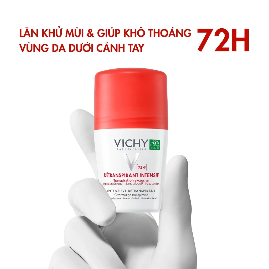 Vichy Détranspirant Intensif 72H Transpiration Excessive là lăn ngăn mồ hôi cường độ cao, được thiết kế dành cho người gặp tình trạng ra mồ hôi quá mức ở vùng dưới cánh tay, bàn tay hoặc bàn chân. Sản phẩm giúp hỗ trợ kiểm soát lượng mồ hôi tiết ra, duy trì cảm giác khô thoáng kéo dài đến 72 giờ theo công bố của hãng, đồng thời hạn chế mùi cơ thể.