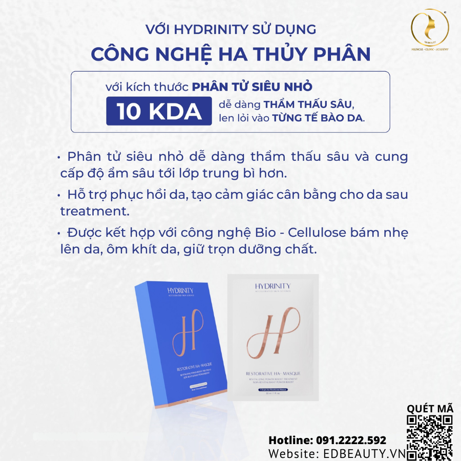 Hydrinity Restorative HA+ Masque là mặt nạ sinh học cao cấp ứng dụng Hyaluronic Acid thủy phân, yếu tố tăng trưởng biểu bì (EGF) và hệ vi sinh Probiotics, giúp cấp ẩm sâu, giảm viêm và thúc đẩy quá trình phục hồi tự nhiên của da.