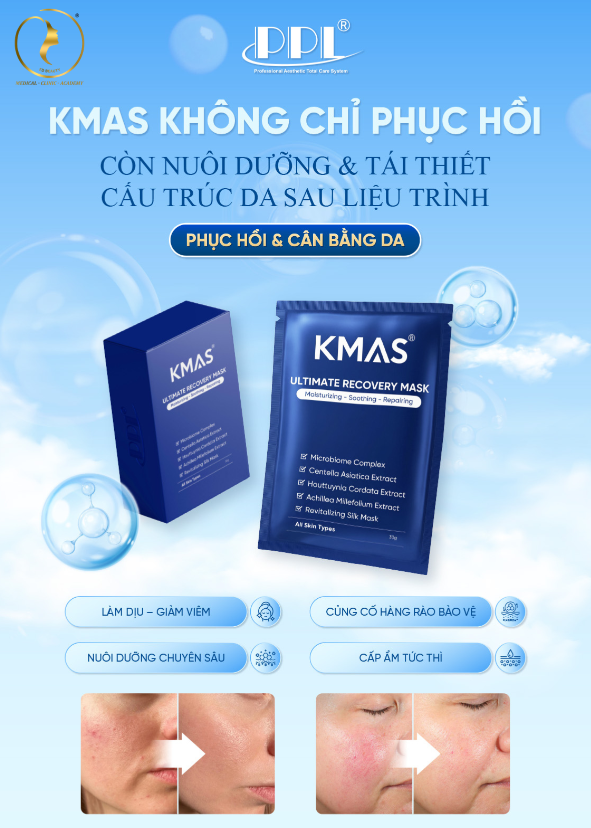 Sau các liệu trình như laser, peel da hay lăn kim, làn da thường trở nên nhạy cảm, dễ kích ứng và mất đi hàng rào bảo vệ tự nhiên. Kmas Ultimate Recovery Mask là giải pháp phục hồi chuyên sâu giúp làm dịu nhanh chóng, giảm đỏ và hỗ trợ tái thiết cấu trúc da từ bên trong.