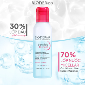 Sensibio H2O Eye Bioderma là dung dịch tẩy trang Micellar 2 lớp chuyên biệt cho vùng mắt và môi nhạy cảm, giúp loại bỏ nhanh lớp trang điểm lâu trôi, kháng nước, đồng thời làm dịu, dưỡng ẩm và bảo vệ hàng rào da mà không gây cay mắt.