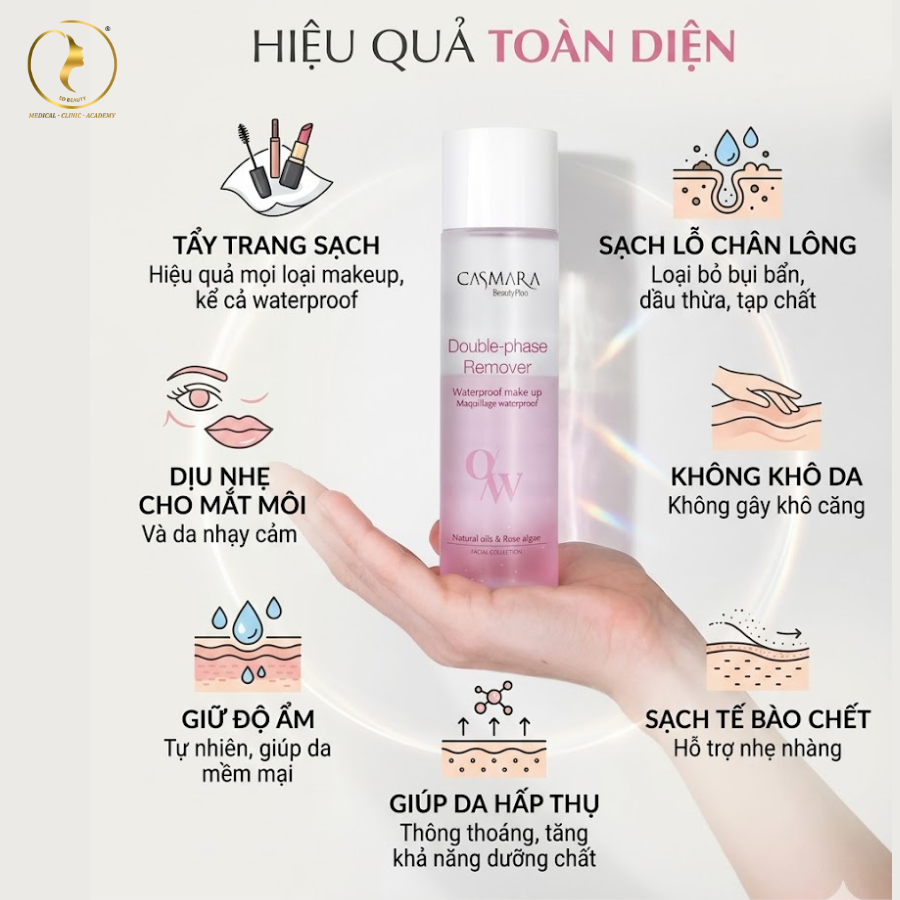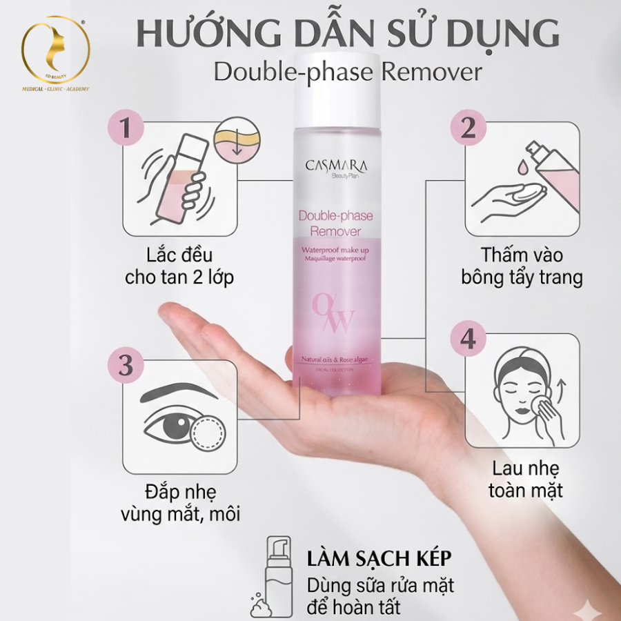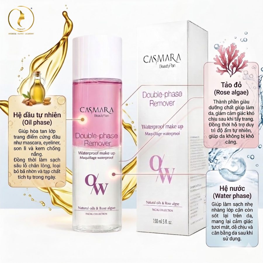 Casmara Double Phase Remover là giải pháp tẩy trang 2 lớp (oil & water) giúp loại bỏ nhanh chóng lớp makeup, kể cả waterproof, đồng thời duy trì độ ẩm tự nhiên cho da. Sản phẩm đặc biệt phù hợp cho vùng mắt – môi nhạy cảm, mang lại cảm giác sạch thoáng nhưng vẫn mềm mại sau khi sử dụng.