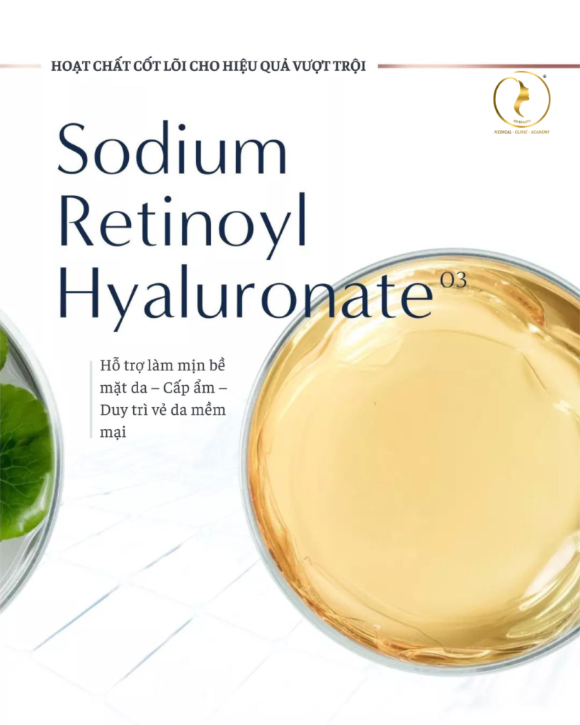 - Sodium Retinoyl Hyaluronate: Dẫn xuất HA giúp vừa trẻ hóa vừa cấp ẩm, hạn chế khô da