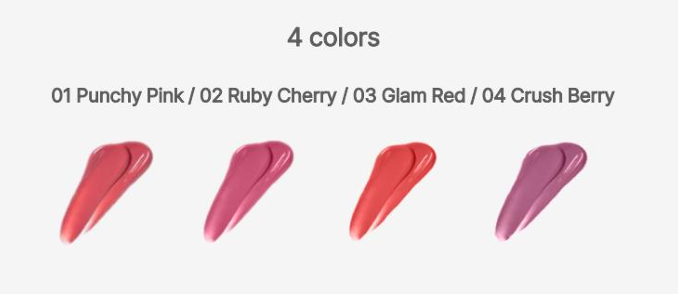 | Màu sắc | Crush Berry, Glam Red, Punchy Pink, Ruby Cherry |