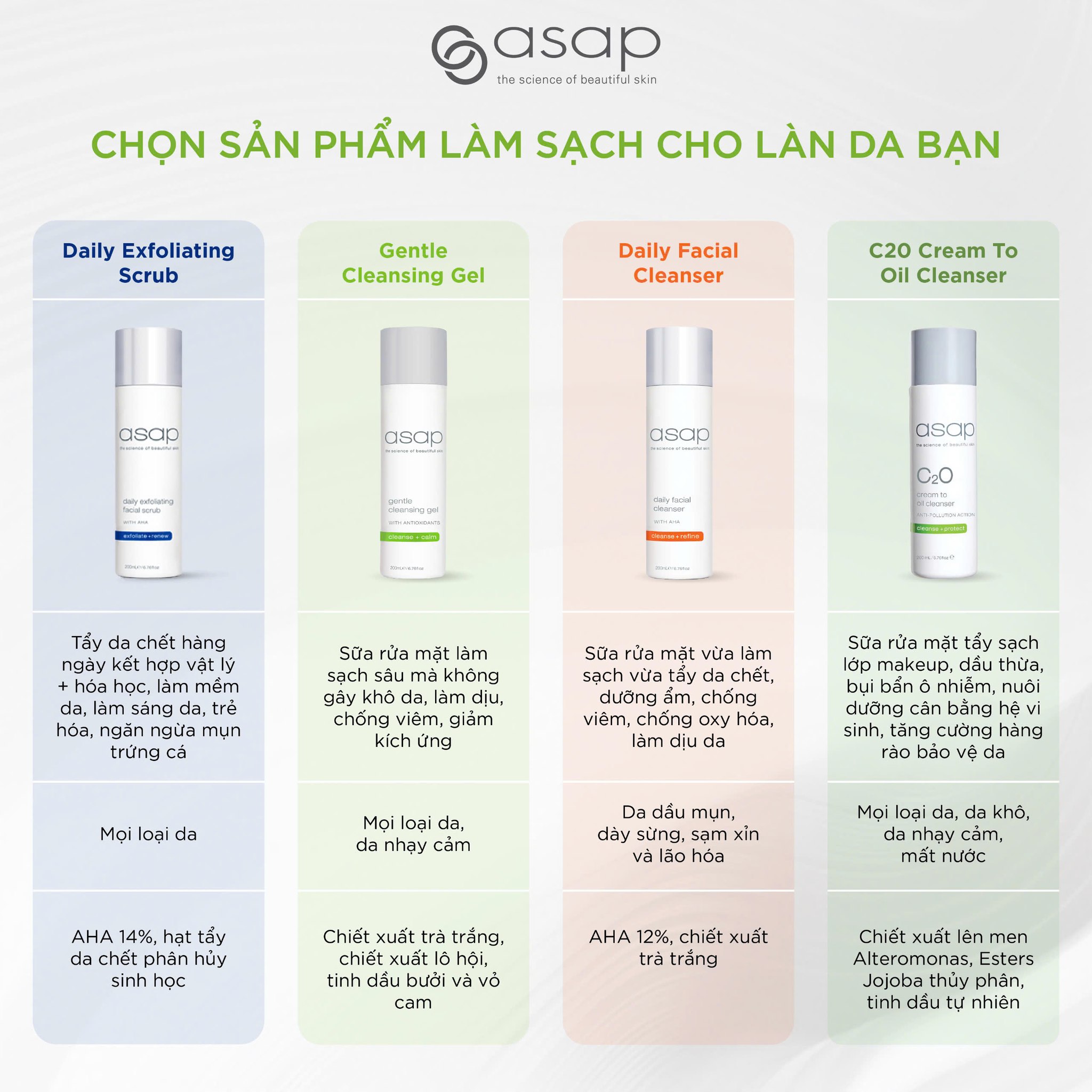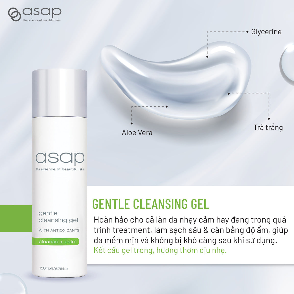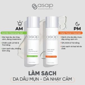 Asap Gentle Cleansing Gel là sữa rửa mặt dịu nhẹ, không chứa xà phòng (soap-free), giúp làm sạch sâu, loại bỏ bụi bẩn, dầu thừa và lớp trang điểm mà vẫn duy trì độ ẩm tự nhiên và hàng rào bảo vệ da.