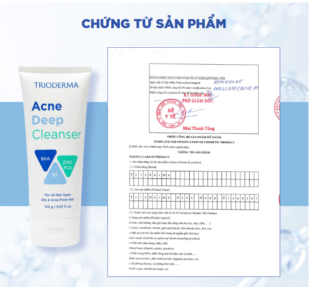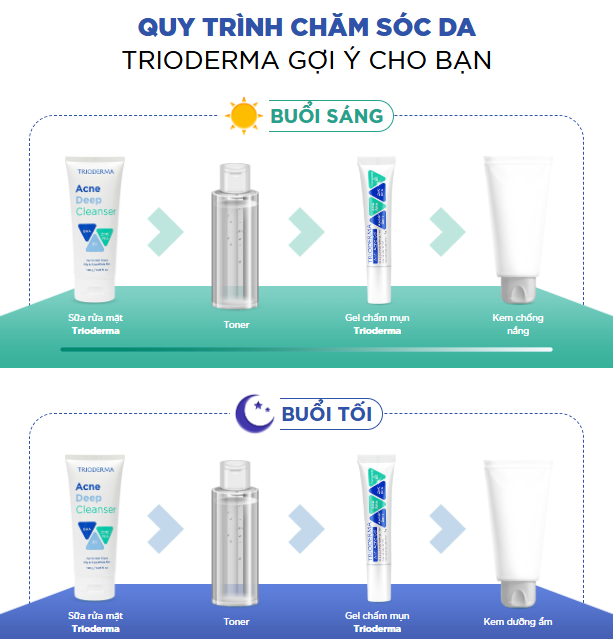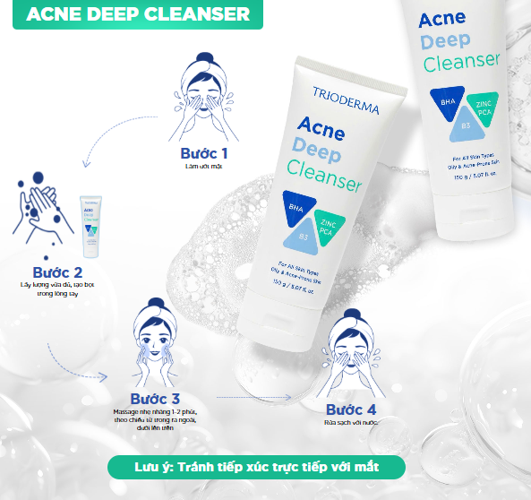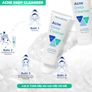 - Rửa sạch lại với nước mát. Sử dụng Sữa rửa mặt Trioderma Acne Deep Cleanser 2 lần/ngày sáng và tối để đạt hiệu quả tốt nhất.