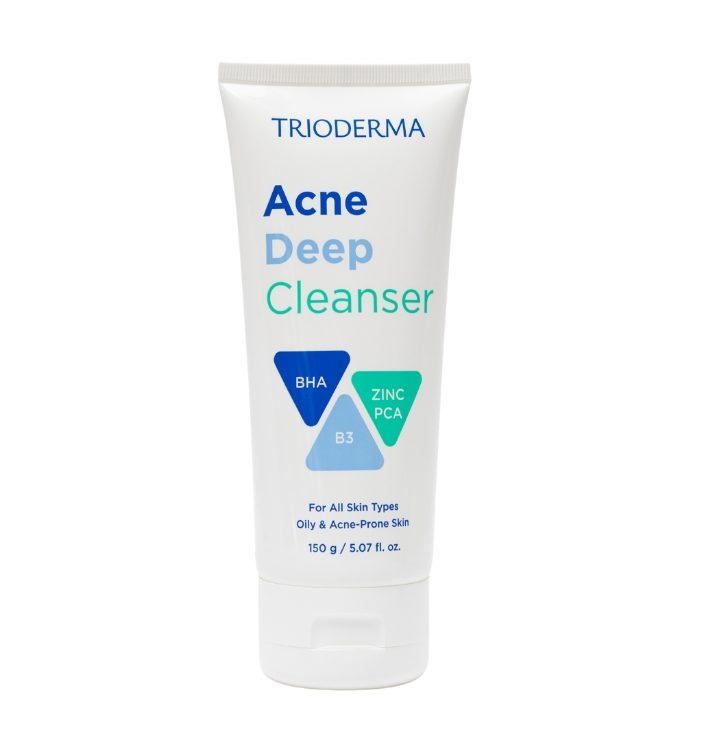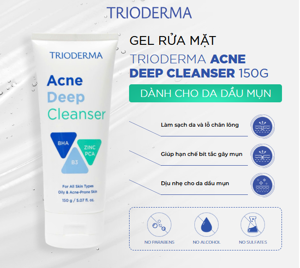 Sữa rửa mặt Trioderma Acne Deep Cleanser là dòng sản phẩm chuyên biệt cho da dầu và da mụn, được nghiên cứu để làm sạch sâu mà vẫn dịu nhẹ cho làn da. Công thức kết hợp giữa BHA, Zn PCA, Niacinamide cùng chiết xuất tự nhiên giúp kiểm soát dầu thừa, ngăn ngừa mụn, giảm viêm và hỗ trợ phục hồi hàng rào bảo vệ da.