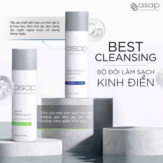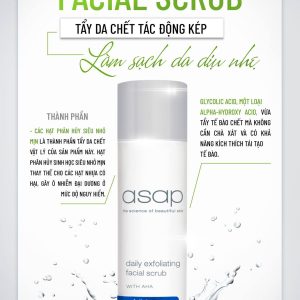 Asap Daily Exfoliating Facial Scrub là sản phẩm tẩy tế bào chết kép (Dual Exfoliation) kết hợp giữa AHA (Glycolic Acid) và hạt tẩy tế bào chết mịn hòa tan sinh học. Công thức khoa học giúp loại bỏ tế bào da chết, làm sáng, mịn và cải thiện kết cấu da mà không gây khô hay kích ứng.