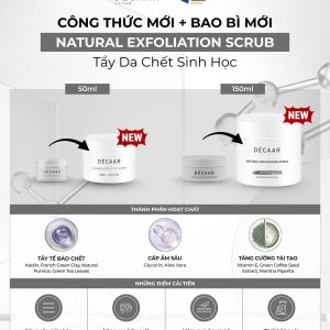 Décaar Natural Exfoliation Scrub là sản phẩm tẩy tế bào da chết sinh học kết hợp cơ học, được phát triển để làm sạch sâu lỗ chân lông, loại bỏ tế bào sừng già cỗi và hỗ trợ tái tạo bề mặt da mà không gây bào mòn hay khô căng da.