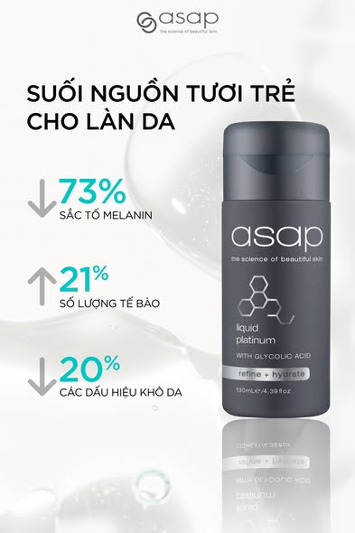 Asap Liquid Platinum là liệu pháp tái tạo da qua đêm chứa Glycolic Acid (AHA) kết hợp với Larch Wood Extract và Saccharide Isomerate – những hoạt chất chống oxy hóa, phục hồi và khóa ẩm vượt trội.