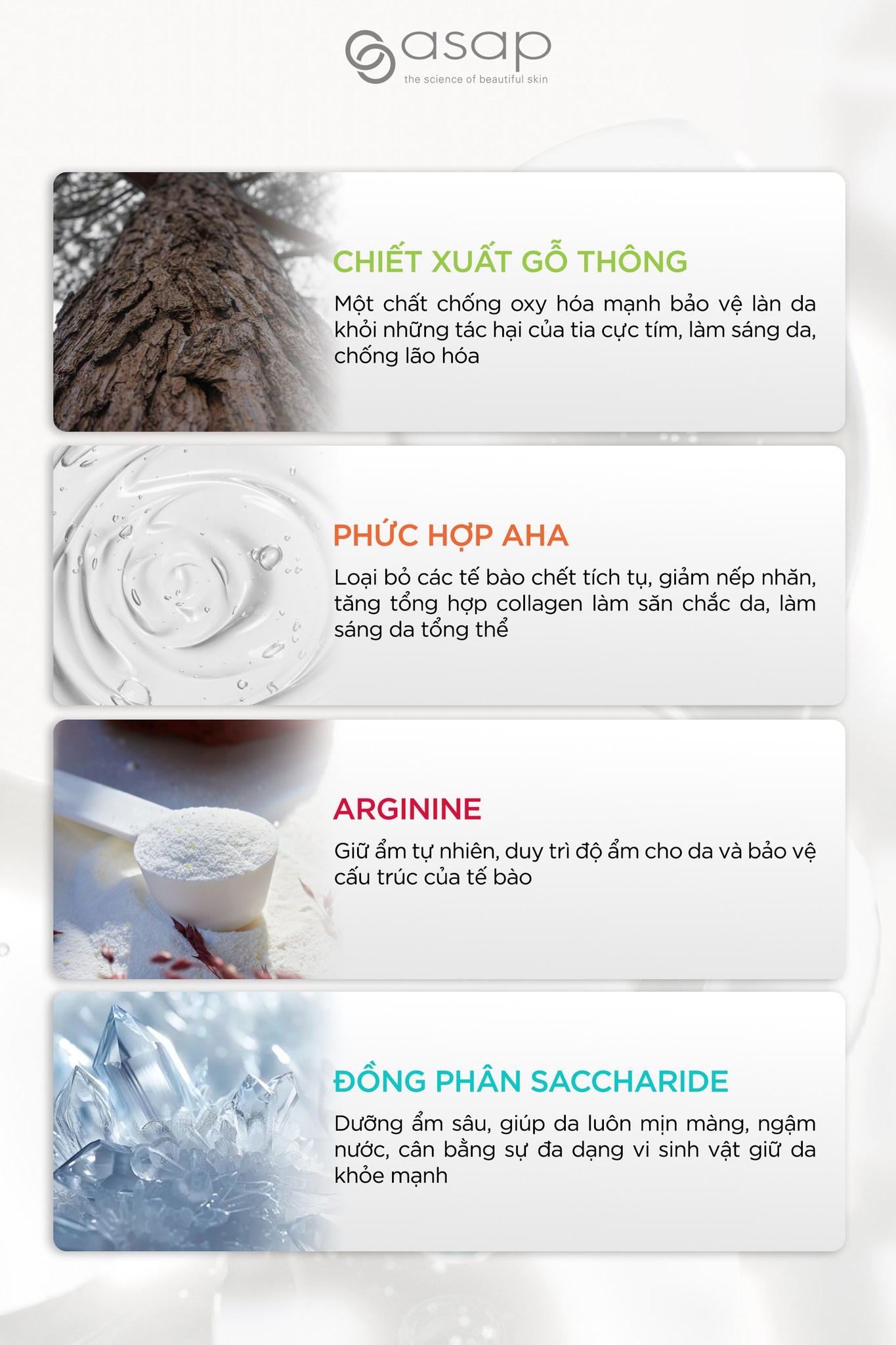 Kết hợp: tiếp tục với serum và kem dưỡng Asap để tối đa hiệu quả tái tạo và cấp ẩm.