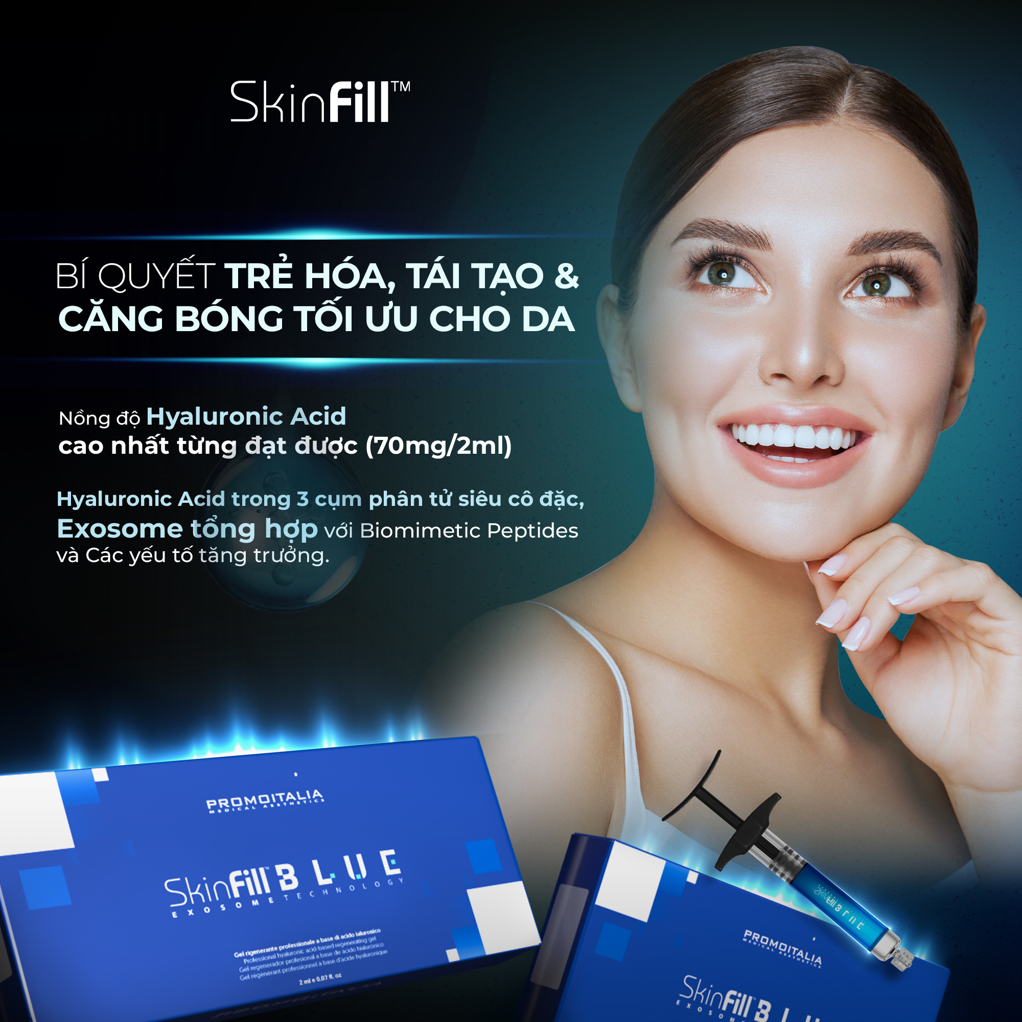Skinfill Blue là tinh chất tái tạo cấu trúc da chuyên sâu, sử dụng công nghệ HA Hybrid thế hệ mới kết hợp exosome tổng hợp giàu peptide mô phỏng sinh học. Sản phẩm giúp phục hồi độ đàn hồi, cải thiện bề mặt da, tăng sinh collagen–elastin và tái tạo toàn diện nhiều lớp da.