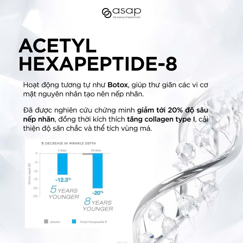 - Acetyl Hexapeptide-8 giúp thư giãn các vi cơ mặt, hỗ trợ giảm sự hình thành nếp nhăn động và kích thích tăng sinh collagen, cải thiện độ săn chắc.