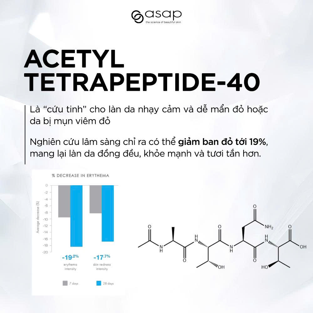 - Acetyl Tetrapeptide-40 làm dịu da, giảm ban đỏ và giúp làn da trông đều màu, khỏe mạnh hơn.