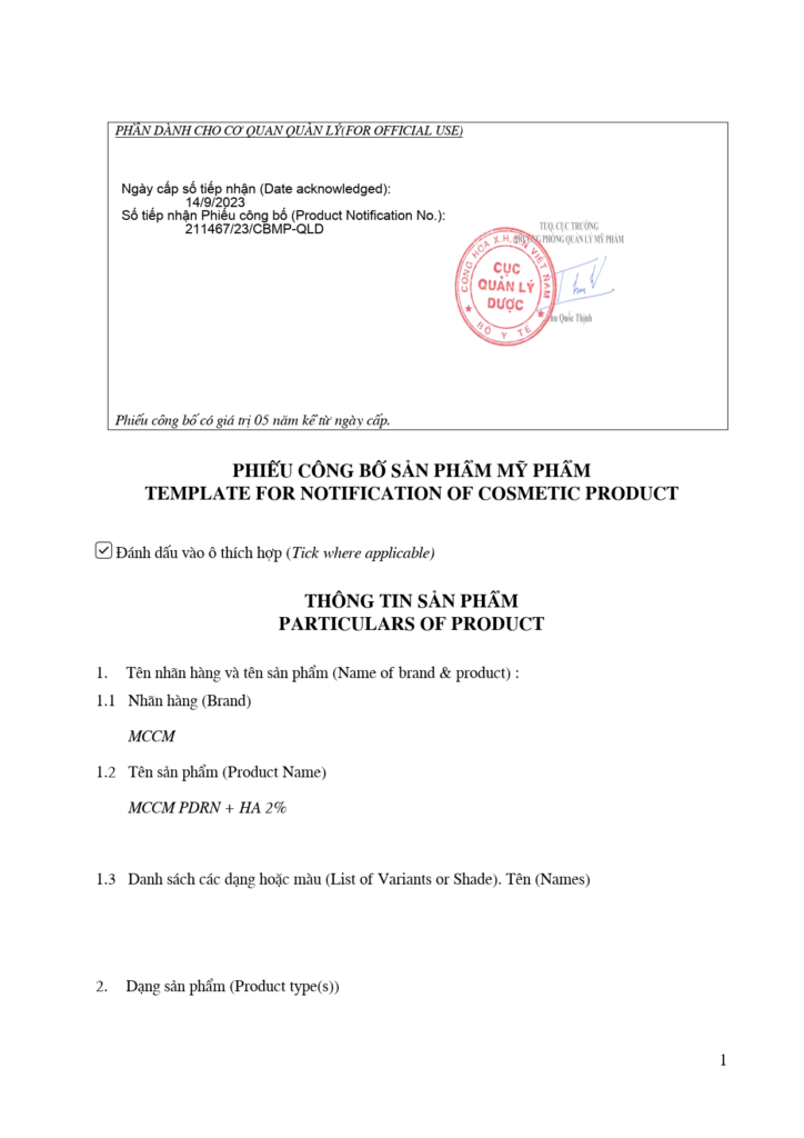 - Tên sản phẩm: MCCM PDRN + Hyaluronic Acid 2%