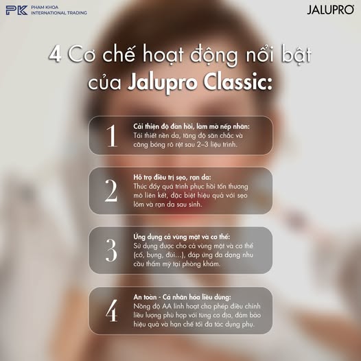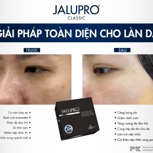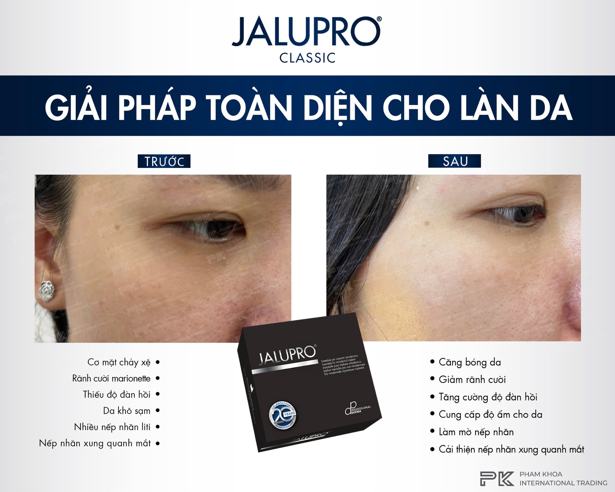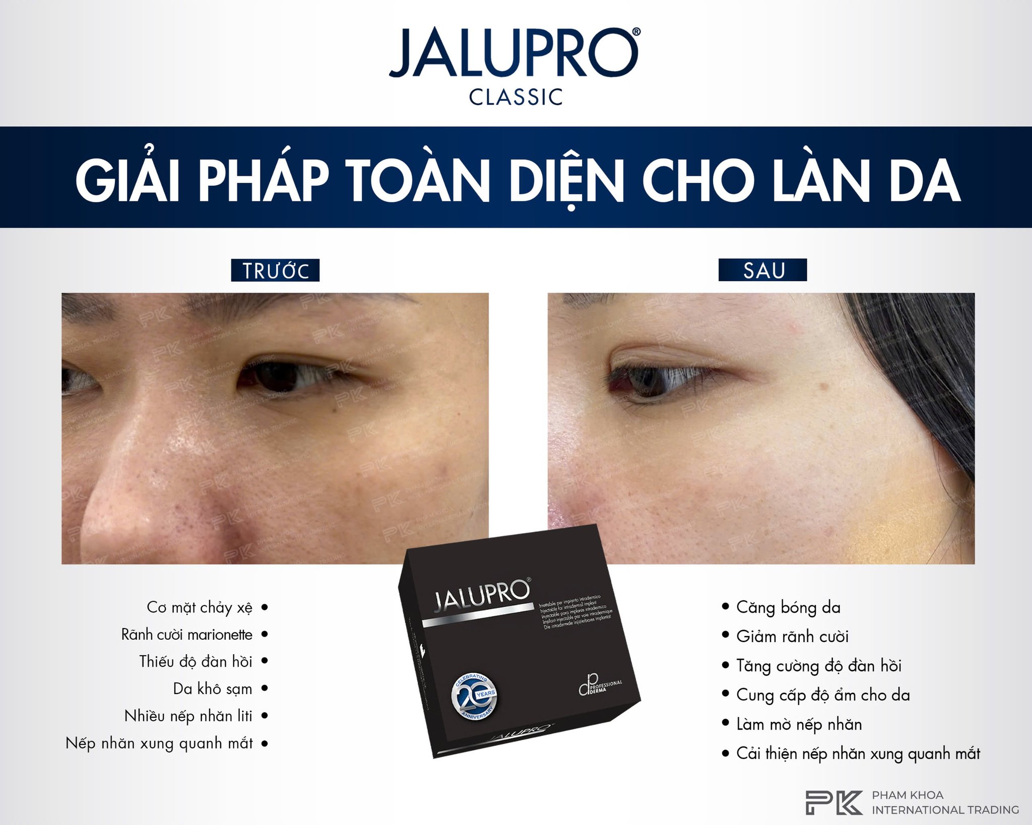 Nhờ bộ đôi thành phần này, Jalupro Classic có khả năng nuôi dưỡng nguyên bào sợi, thúc đẩy tăng sinh Collagen – Elastin và cấp ẩm mạnh, mang lại làn da căng bóng, săn chắc và trẻ hóa toàn diện. Sản phẩm được ứng dụng hiệu quả cho da mặt, cổ, vùng mắt và cả da đầu trong trường hợp tóc thưa mỏng.