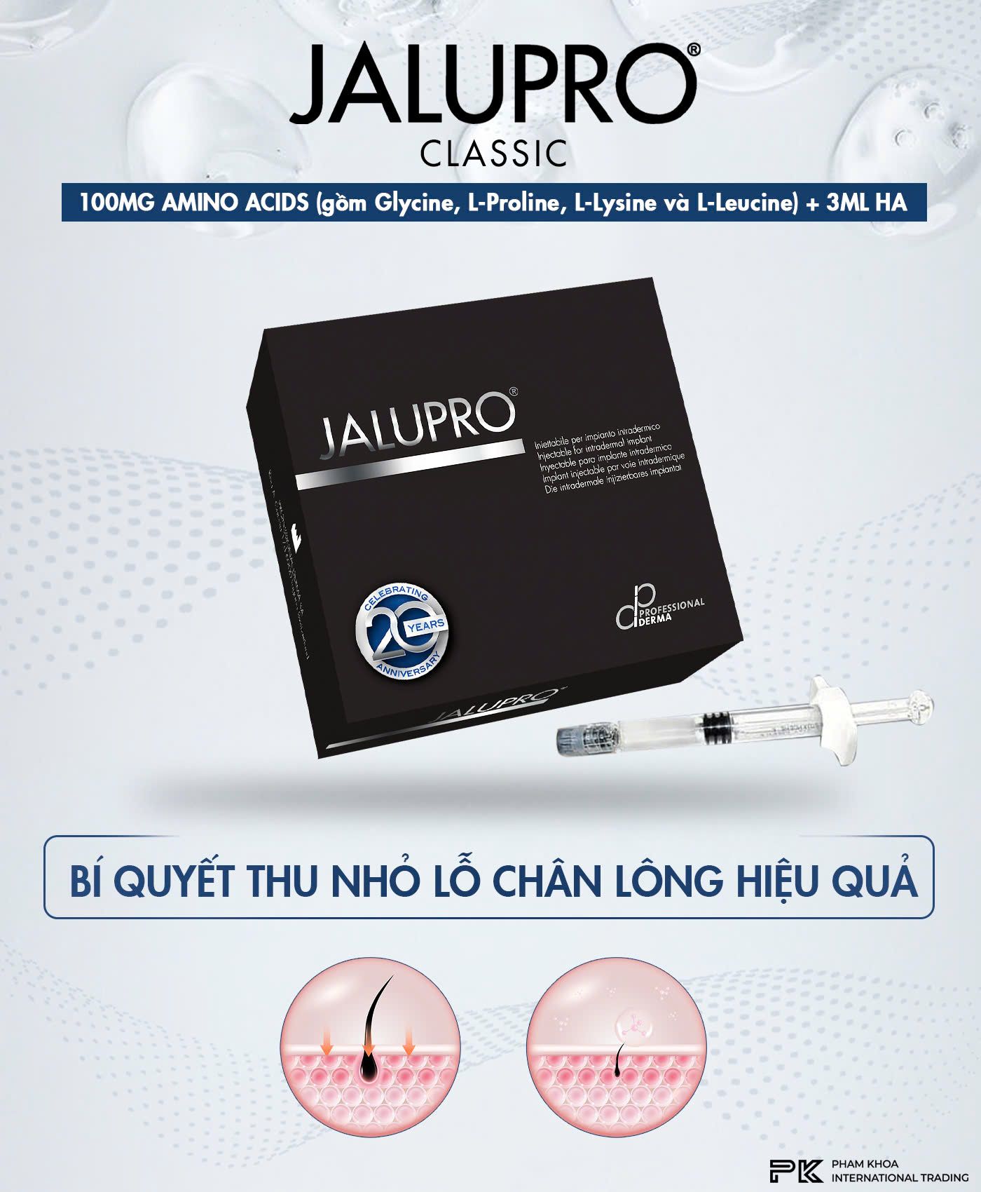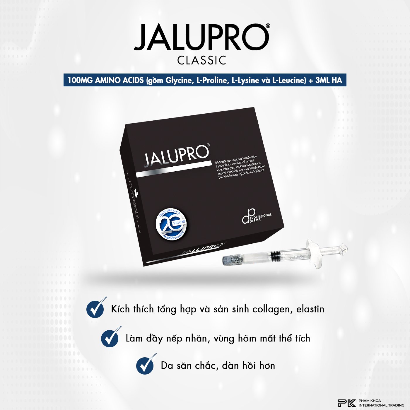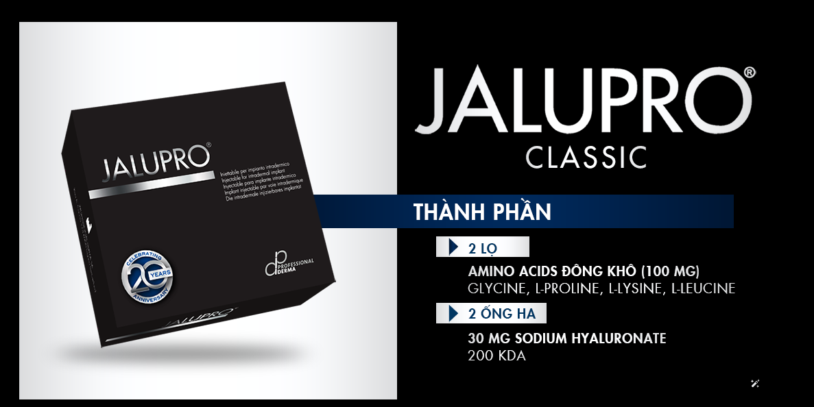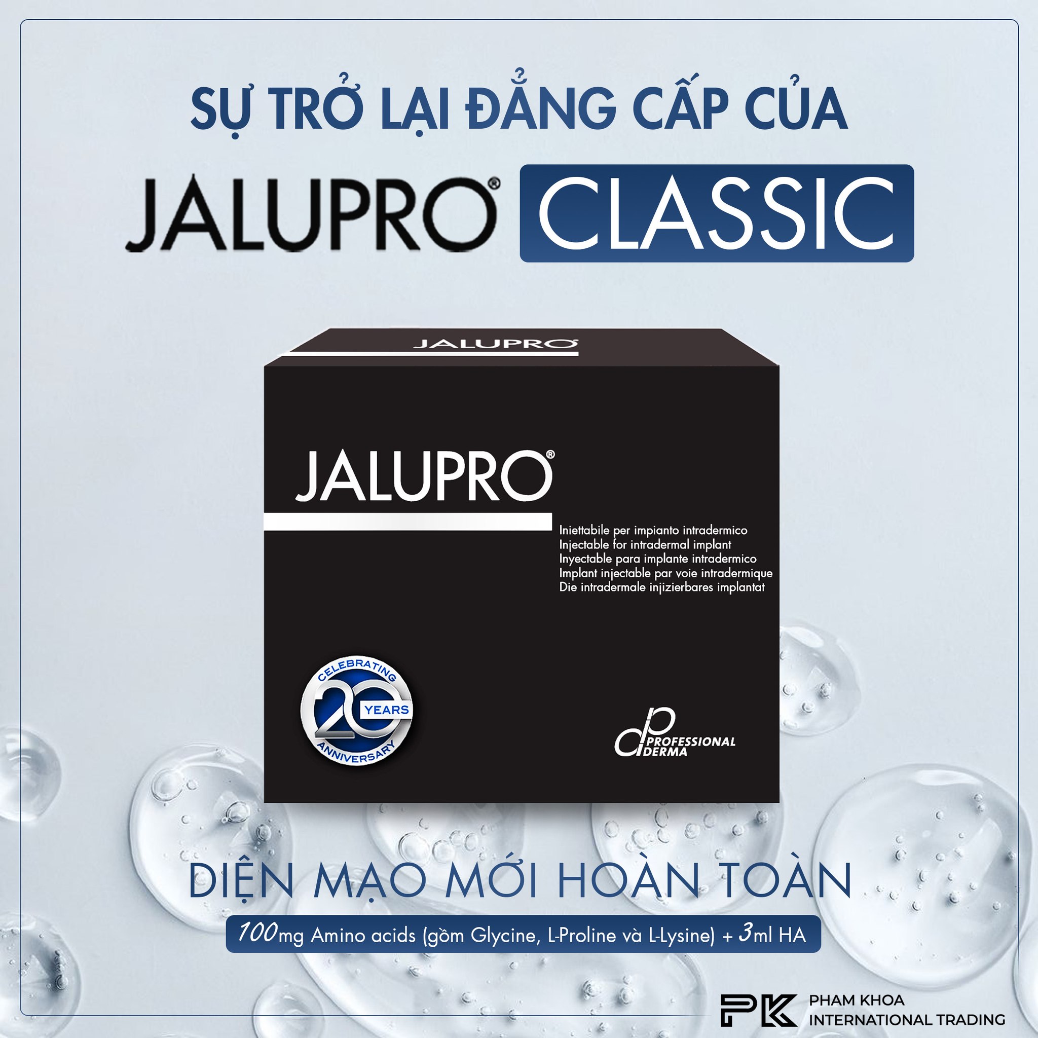 Jalupro Classic là giải pháp sinh học tái tạo da giúp phục hồi độ đàn hồi, làm mờ nếp nhăn và cải thiện cấu trúc da từ sâu bên trong qua phương pháp meso. Sản phẩm hoạt động dựa trên sự kết hợp của 100mg Amino Acids (Glycine, L-Proline, L-Lysine, L-Leucine), 30mg Sodium Hyaluronate (HA 200kDa).