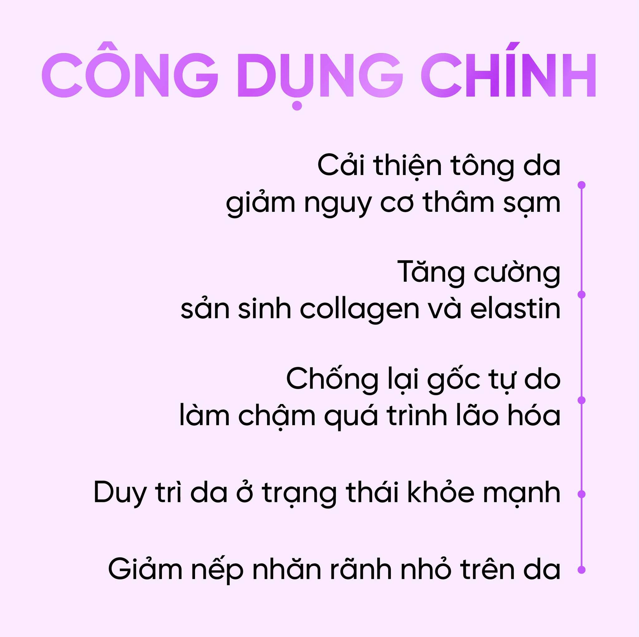Sản phẩm mang lại làn da mịn màng, đều màu, giảm rõ rệt nếp nhăn và tăng độ đàn hồi – phù hợp cho mọi loại da, đặc biệt là da có dấu hiệu lão hóa hoặc da nhạy cảm với retinol thông thường.