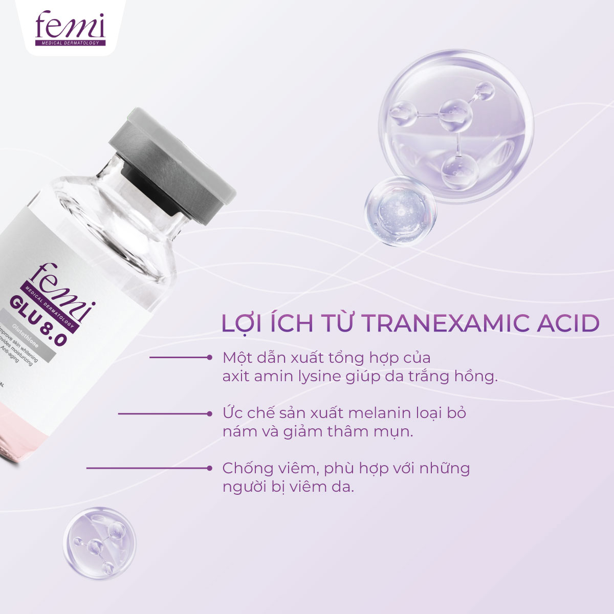 Femi Glu 8.0 mang lại hiệu quả rõ rệt nhờ công thức chứa Glutathione 10% kết hợp Tranexamic Acid, Vitamin C, Amino Acid và Multi-peptide. Đây là giải pháp đưa hoạt chất thẩm thấu sâu vào lớp biểu bì để giảm melanin, làm sáng da, cải thiện nám và làm da căng bóng, đều màu.