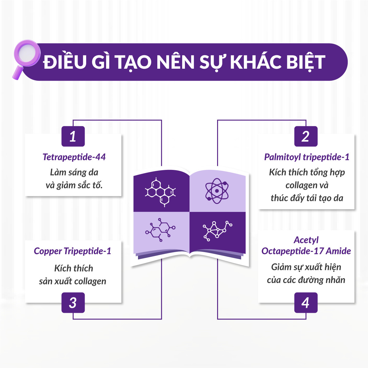 Peptide và Amino Acid hỗ trợ tái tạo cấu trúc da, mang lại bề mặt da mịn màng, tươi sáng hơn.