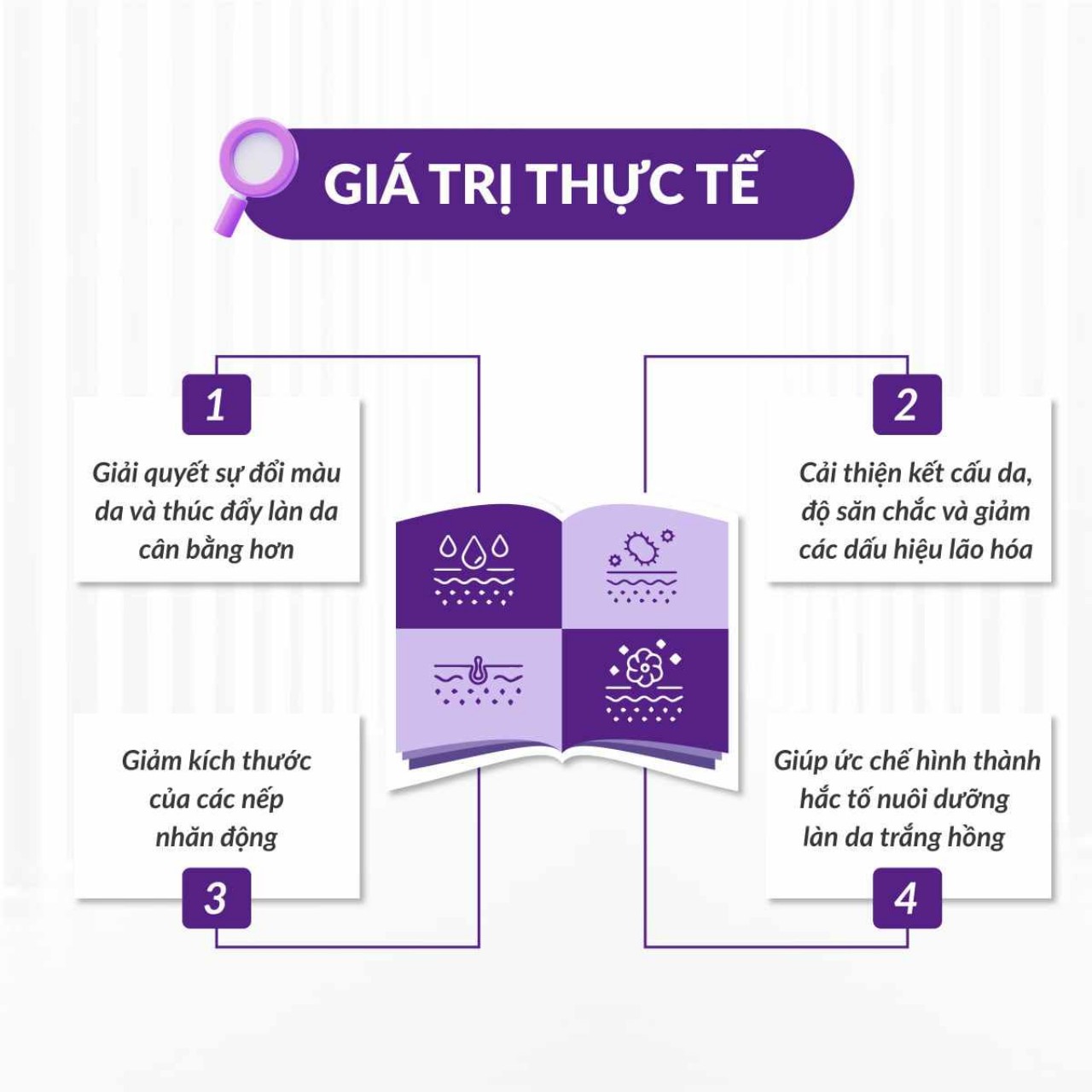 Giảm sản xuất melanin từ sâu bên trong, hỗ trợ cải thiện nám, tàn nhang, da xỉn màu.