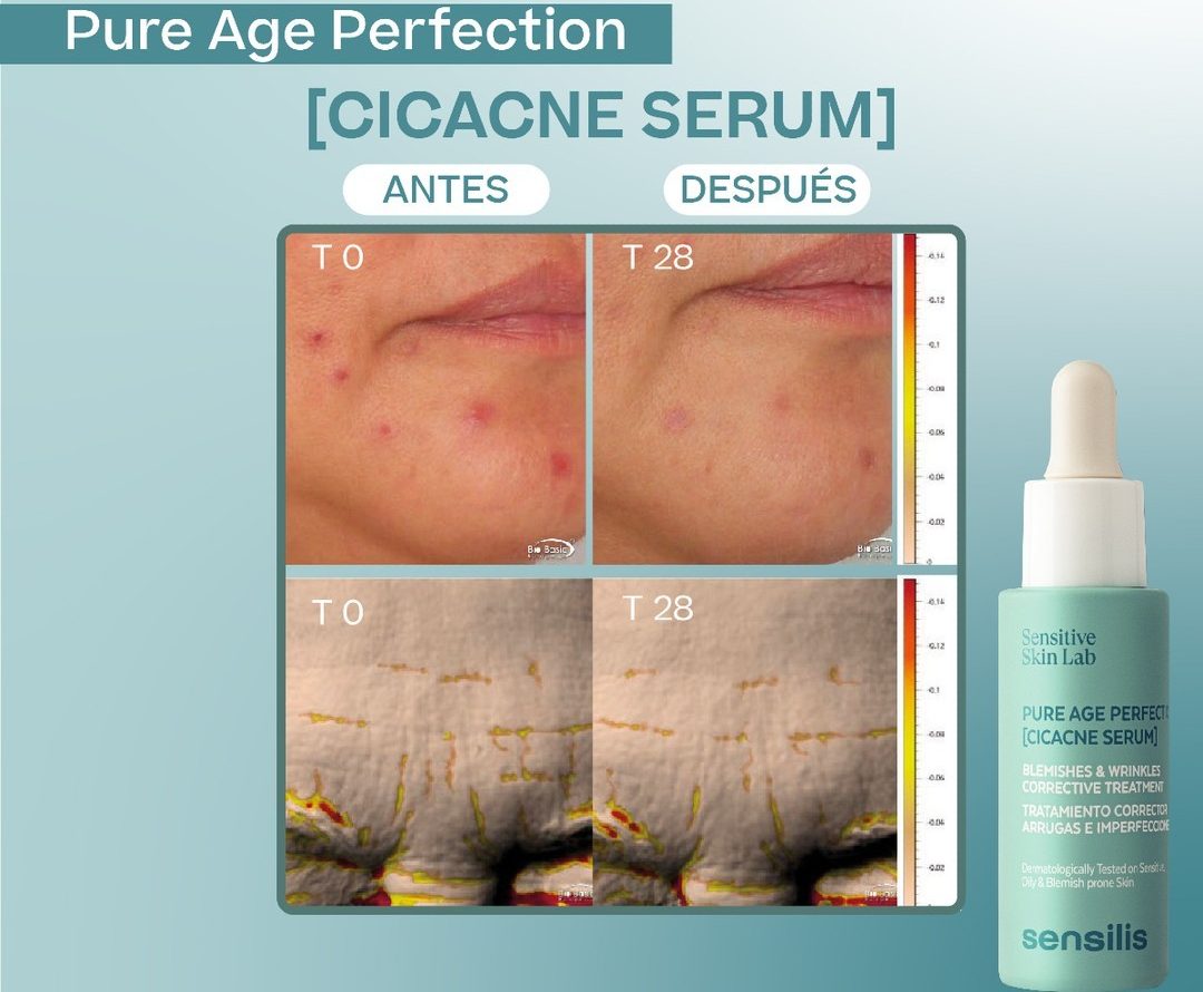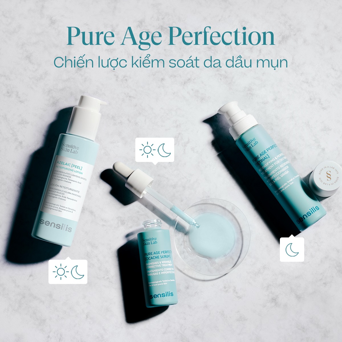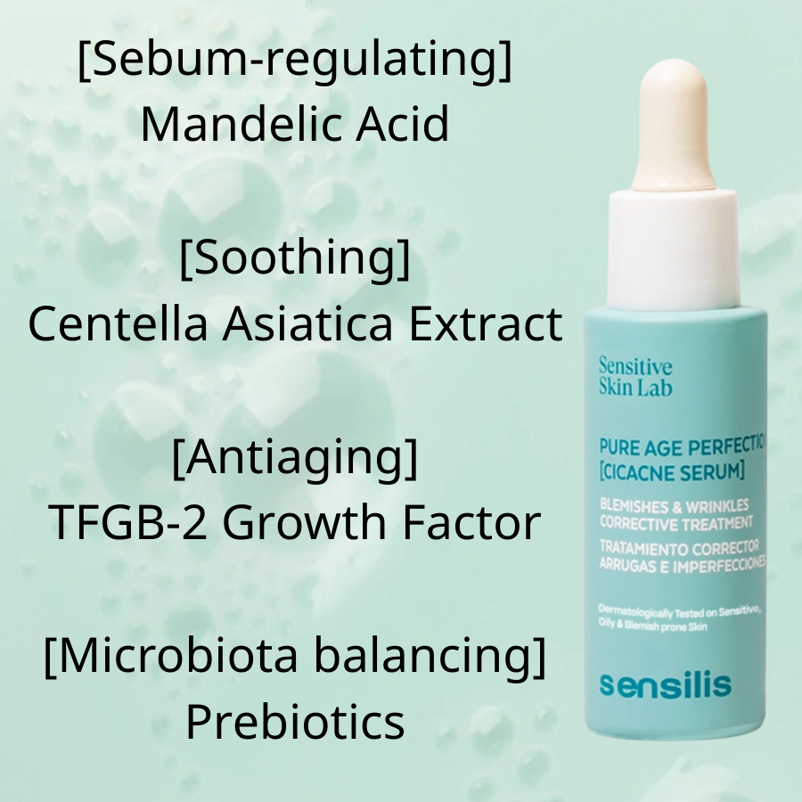 Tinh chất Sensilis Pure Age Perfection Cicacne Serum là serum oil-free, kết cấu siêu lỏng được nghiên cứu chuyên biệt cho da dầu, da mụn nhạy cảm và mụn trưởng thành (adult acne). Sản phẩm mang lại tác động kép: giảm mụn – cải thiện nếp nhăn, đồng thời hỗ trợ tái tạo cấu trúc da mà vẫn đảm bảo độ dịu nhẹ cao, phù hợp cả với làn da yếu hoặc da sau các liệu trình thẩm mỹ da liễu.