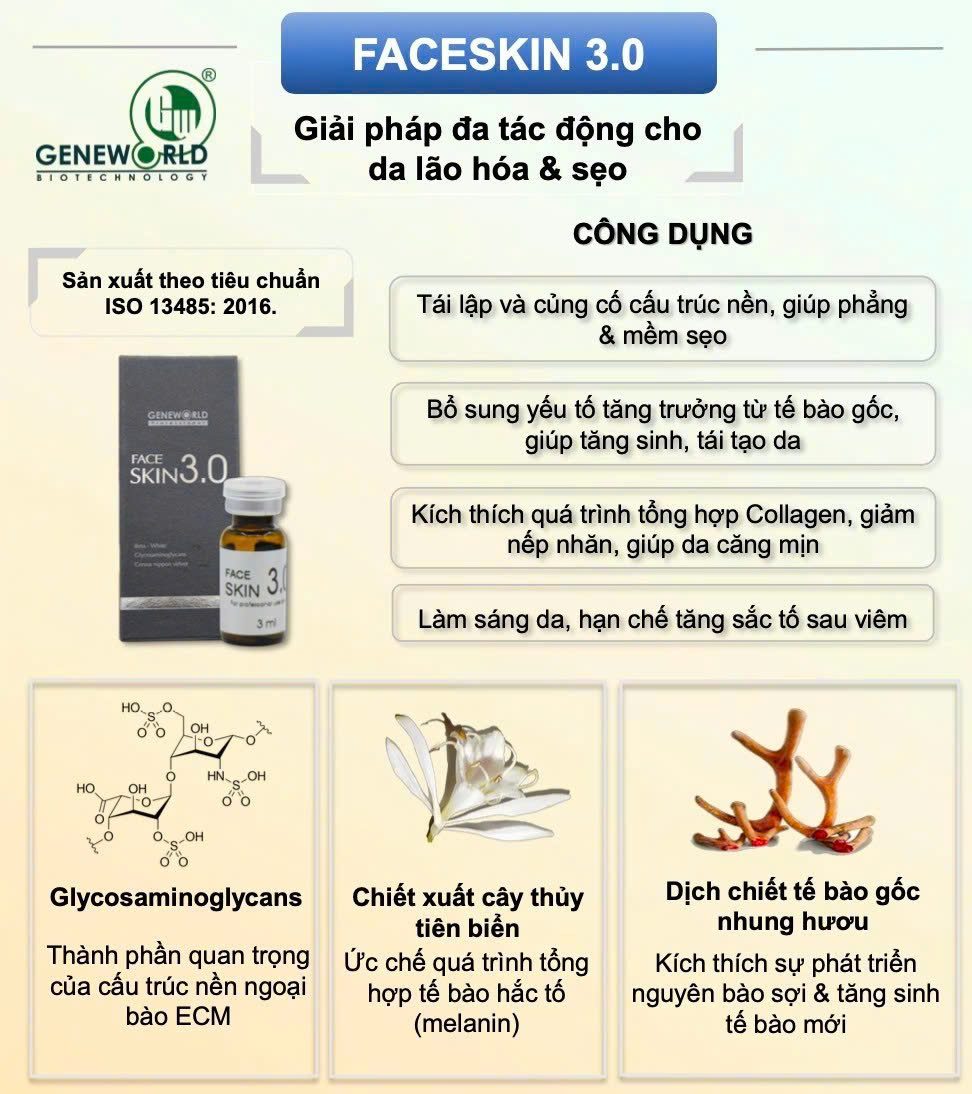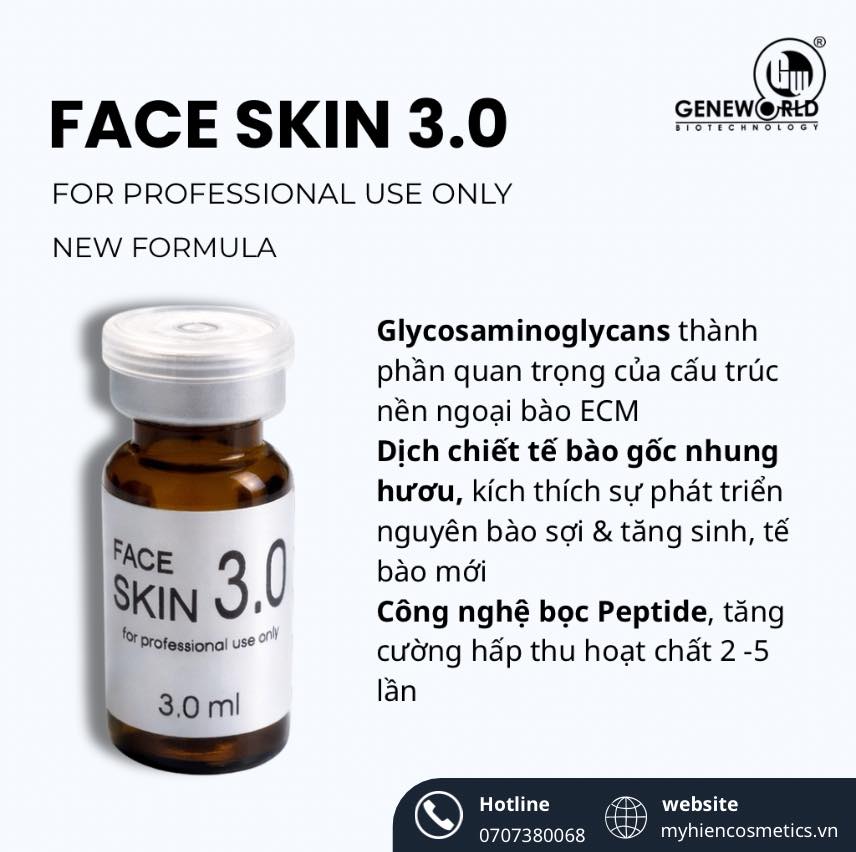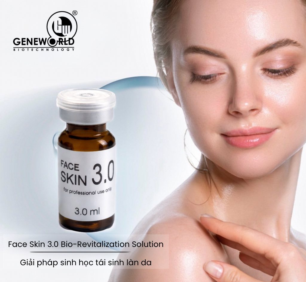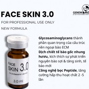 Dung dịch điều trị da Faceskin 3.0 Geneworld là giải pháp hỗ trợ tái tạo da, phục hồi sẹo rỗ và trẻ hóa chuyên sâu dành cho làn da tổn thương, lão hóa hoặc cần phục hồi nhanh sau các liệu trình thẩm mỹ xâm lấn. Sản phẩm hoạt động bằng cách kích thích tăng sinh collagen, tái tạo mô mới và cải thiện cấu trúc da từ nền sâu, giúp bề mặt da dần trở nên mịn màng, săn chắc và đều màu hơn.