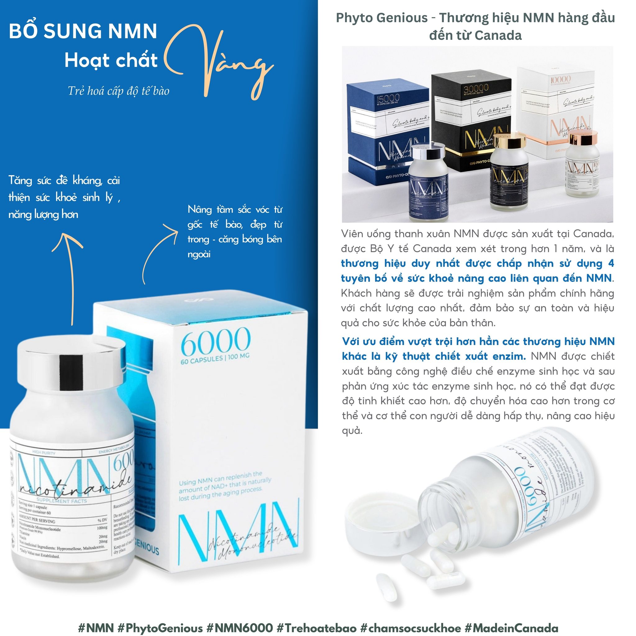 NMN Phyto Genious 6000 – 60 viên là thực phẩm bổ sung thế hệ nâng cấp, cung cấp 100 mg NMN tinh khiết (99,9%) trong mỗi viên, kết hợp Vitamin B1 (Thiamine) và Vitamin B3 (Niacin).