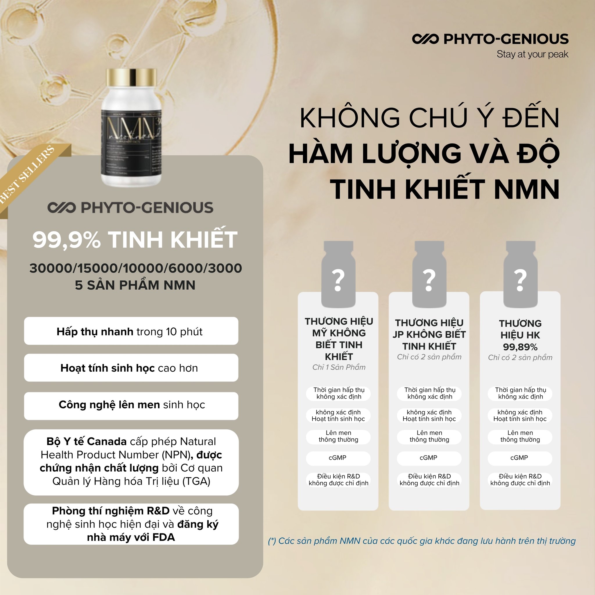 Với hàm lượng NMN cao nhất trong dòng sản phẩm, NMN Phyto Genious 30000 tập trung vào việc hỗ trợ các quá trình sinh học quan trọng, giúp duy trì năng lượng và sức khỏe tổng thể:
