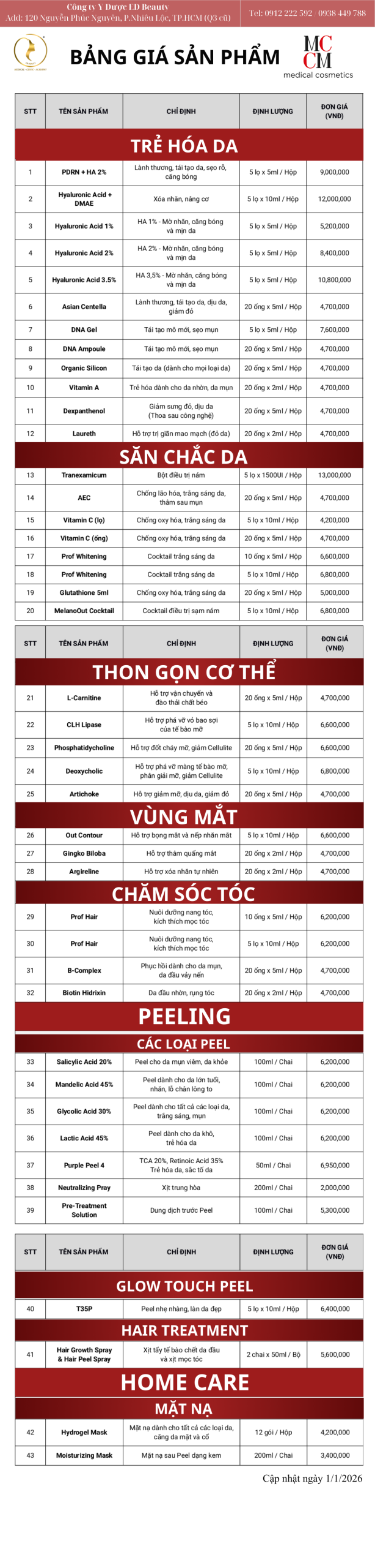 Kính gửi quý khách hàng thân thiết! Ed Beauty, xin trân trọng cập nhật Bảng giá sản phẩm MCCM mới nhất. Với niềm tự hào và tâm huyết, chúng tôi cam kết mang đến cho quý khách hàng những sản phẩm chính hãng và chất lượng vượt trội từ thương hiệu MCCM.